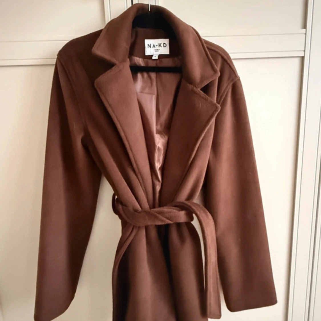 Snygg brun kappa från NA-KD med klassisk krage och bälte i midjan. Jackan har lång ärm och en stilren, enkel design som passar perfekt till höst och vinter. Materialet är mjukt och ger en lyxig känsla. Perfekt för dig som gillar tidlös stil.