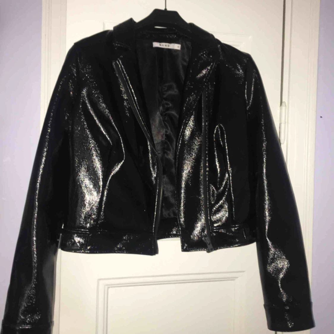Lackad skinnjacka från NAKD med rosa/rött och blått blom broderi på baksidan. Nypris 700k storlek 38, använd ca 3 gånger