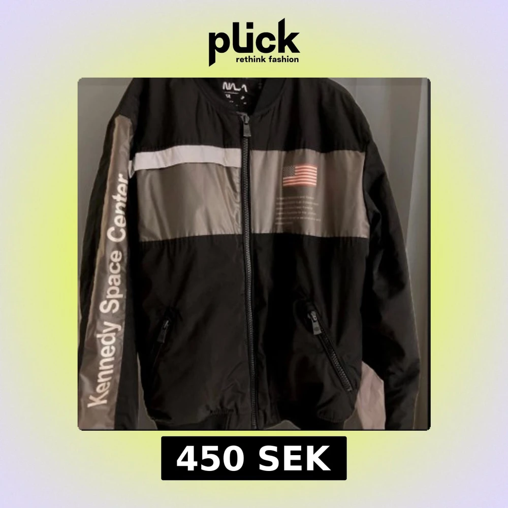 Svart och grå bomberjacka från NASA med tryckta detaljer som amerikansk flagga, Kennedy Space Center och United States of America på ärmarna. Insidan har coola tekniska ritningar av rymdfarkoster. Jackan har dragkedja och två fickor framtill.