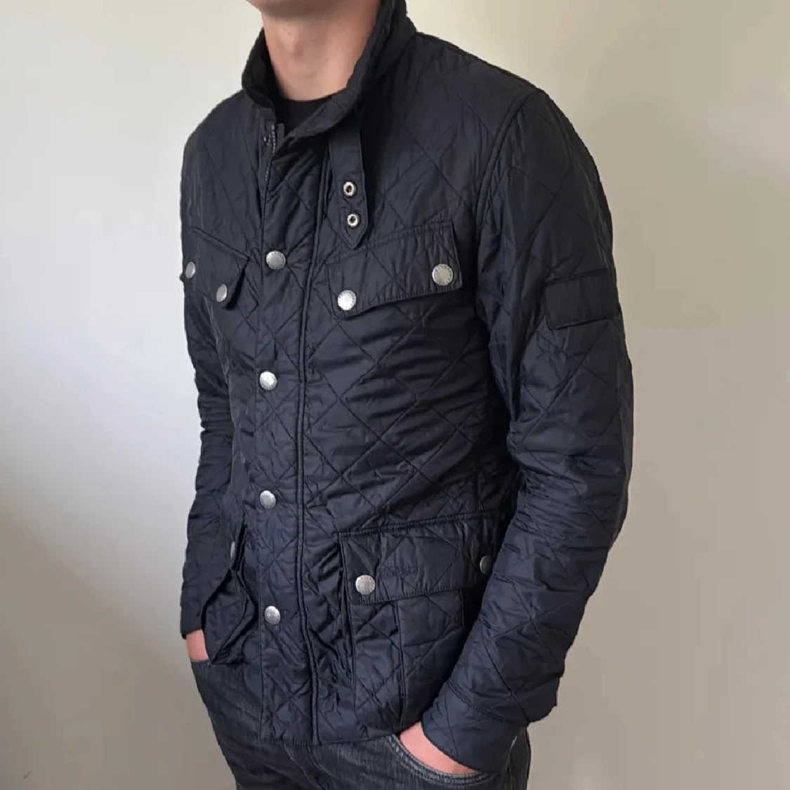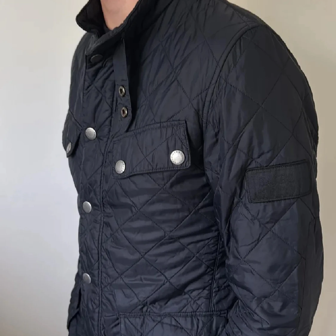 Riktigt snygg navy blå Barbour jacka perfekt till höst och tidig vinter. Nypris ca:4500kr mitt pris 750kr. Grabben på bilden är ca 180 cm lång
