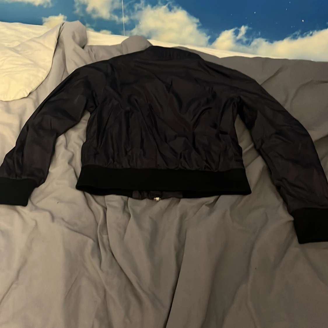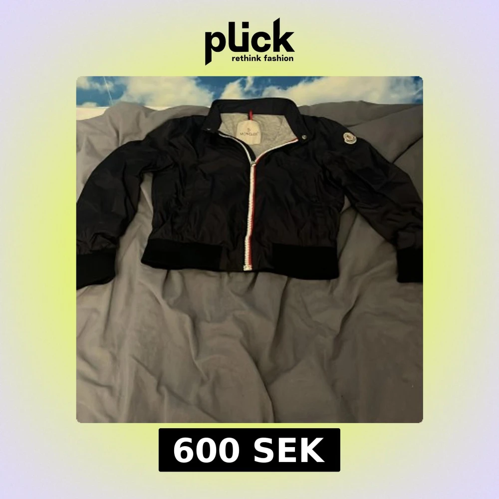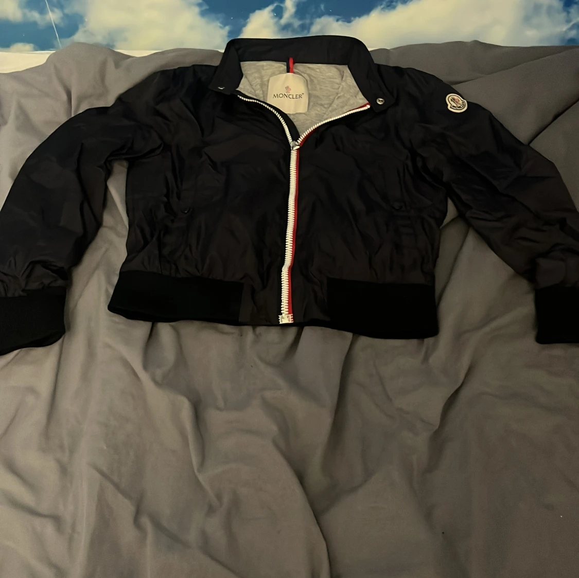 Svart vindjacka från Moncler med klassisk krage och ribbade muddar. Jackan har en snygg dragkedja med röd, vit och blå detalj samt Moncler-logga på ärmen. Tillverkad i polyester och har en normal passform. Perfekt för dig som vill ha en stilren och sportig look.