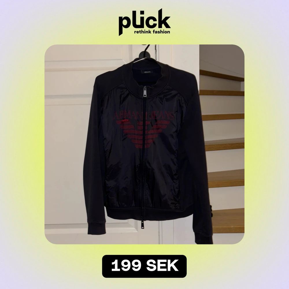Snygg mörkblå cardigan ish från Armani Jeans med röd logga på bröstet. Jackan har dragkedja och är långärmad, perfekt för höst och vår. Materialet är en mix av syntet och bomull vilket gör den både bekväm och stilren. Passar perfekt för en casual look eller en utekväll. Den har en liten slitning vid bröstet vilket man kan se på bilderna. Den är M men passar även storlek S.