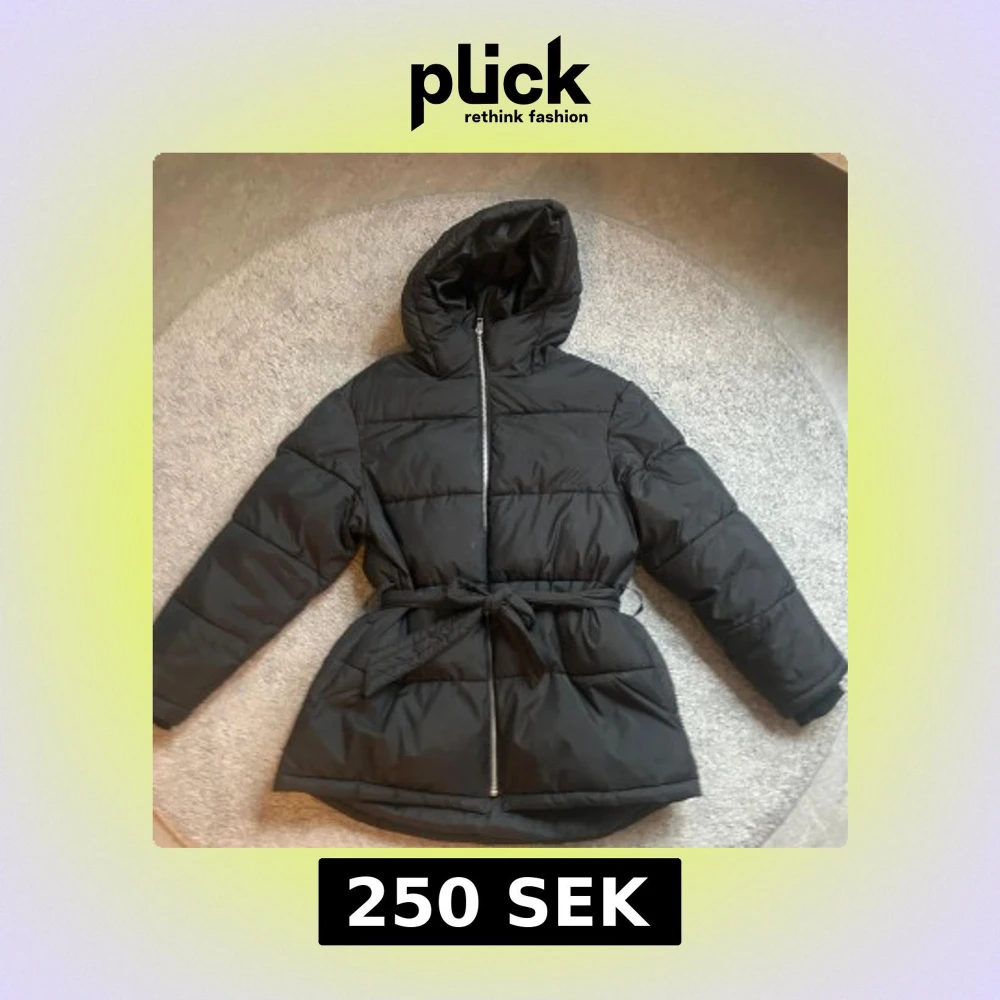 Säljer en svart dunjacka med huva och dragkedja. Jackan har ett bälte i midjan för en snygg passform och långa ärmar. Perfekt för kyliga dagar.