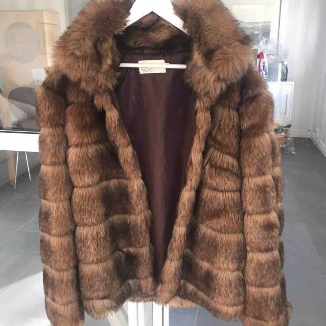 En brun fakepäls från Nelly.com i storlek 38. Stor krage och fungerar jättebra som vinterjacka. Köpt för 1000 kr.