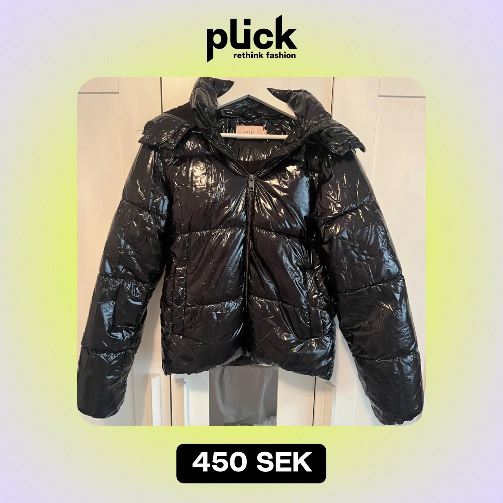 Säljer en snygg svart pufferjacka från Nelly i storlek XS. Jackan har en glansig finish och dragkedja framtill. Perfekt för kalla vinterdagar, den är väldigt varm. Den har långa ärmar och en mysig huva. Jackan kostar 799kr på hemsidan och är slutsåld.🤍