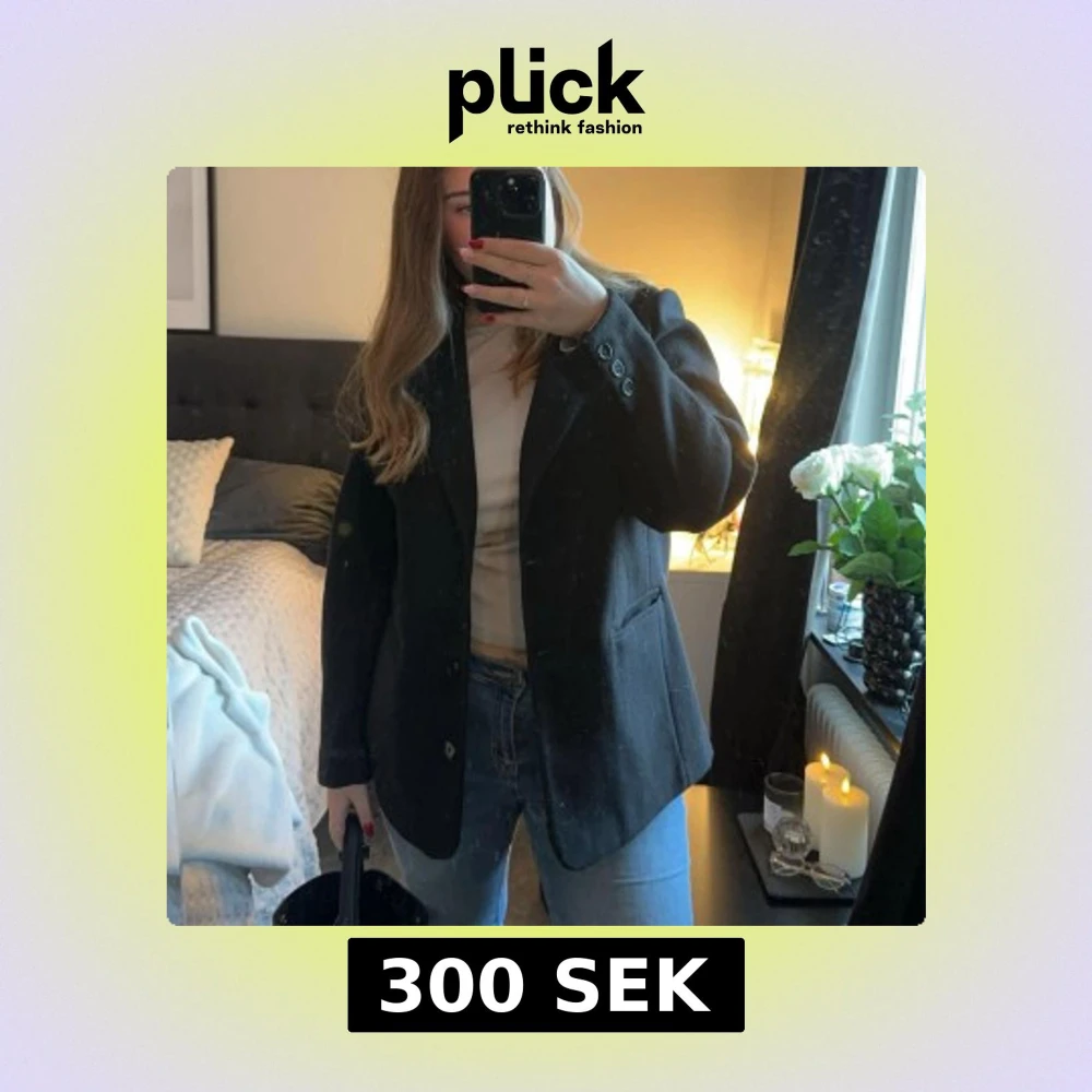 En kavaj i tjockare material, perfekt till höst och vinter. Den är oversized så skulle säga att den är storlek L. Använd få gånger🫶🏼