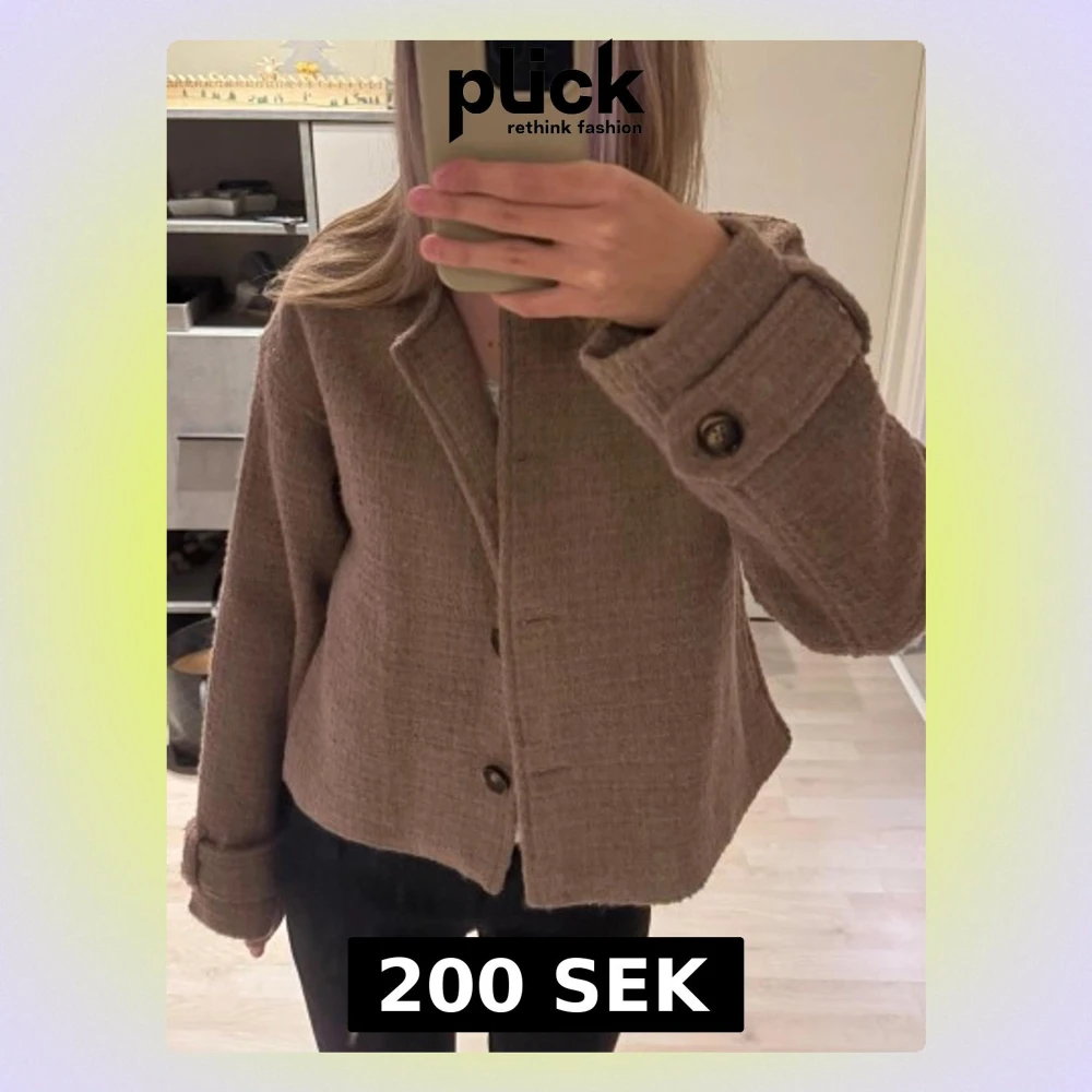 Säljer en beige kavajkappa med mjuk och varm textur och snygga bruna knappar framtill. Jackan har en rak, lite croppad passform och långa ärmar med dekorativa manschetter. Perfekt för dig som gillar stilrena och klassiska plagg med en modern twist.