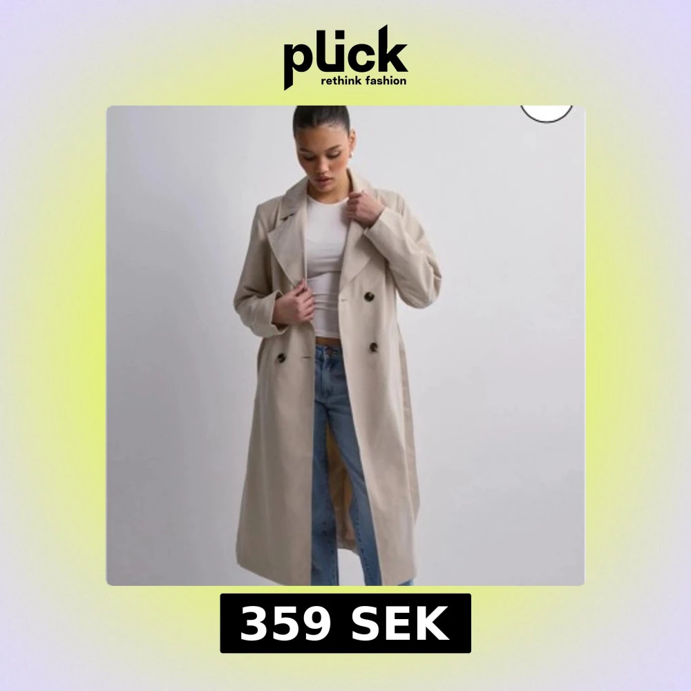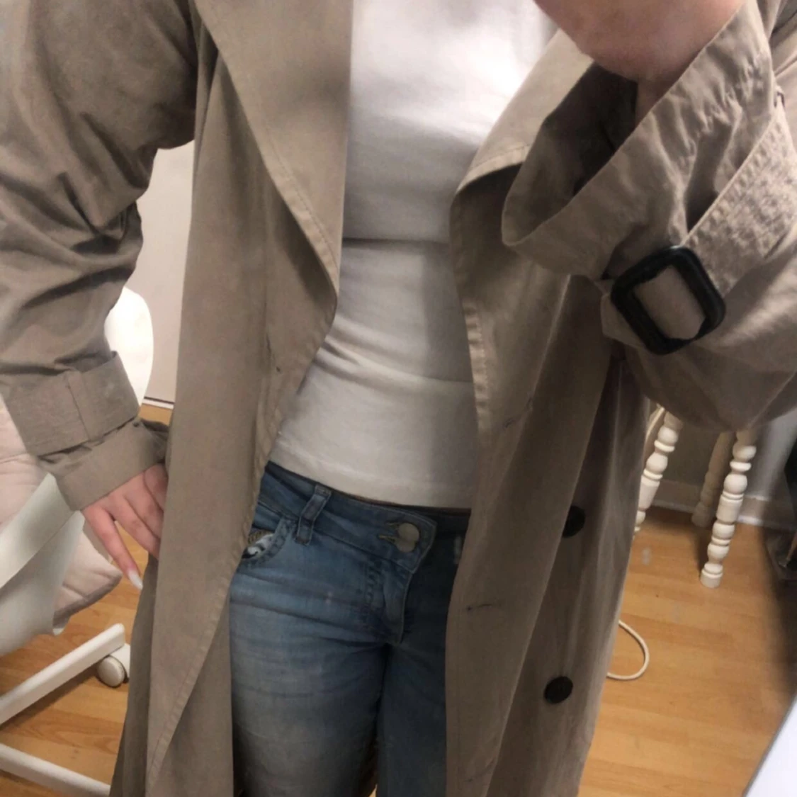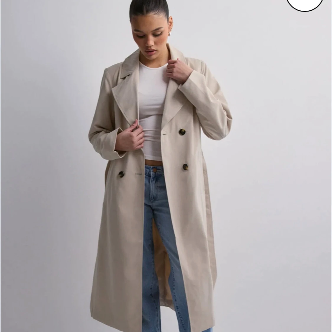 Snygg beige trenchcoat med klassisk krage, dubbelknäppning och bälte i midjan. Jackan har långa ärmar med spänne vid mudden och en stilren, loose passform. Orginalpriset 759 kr