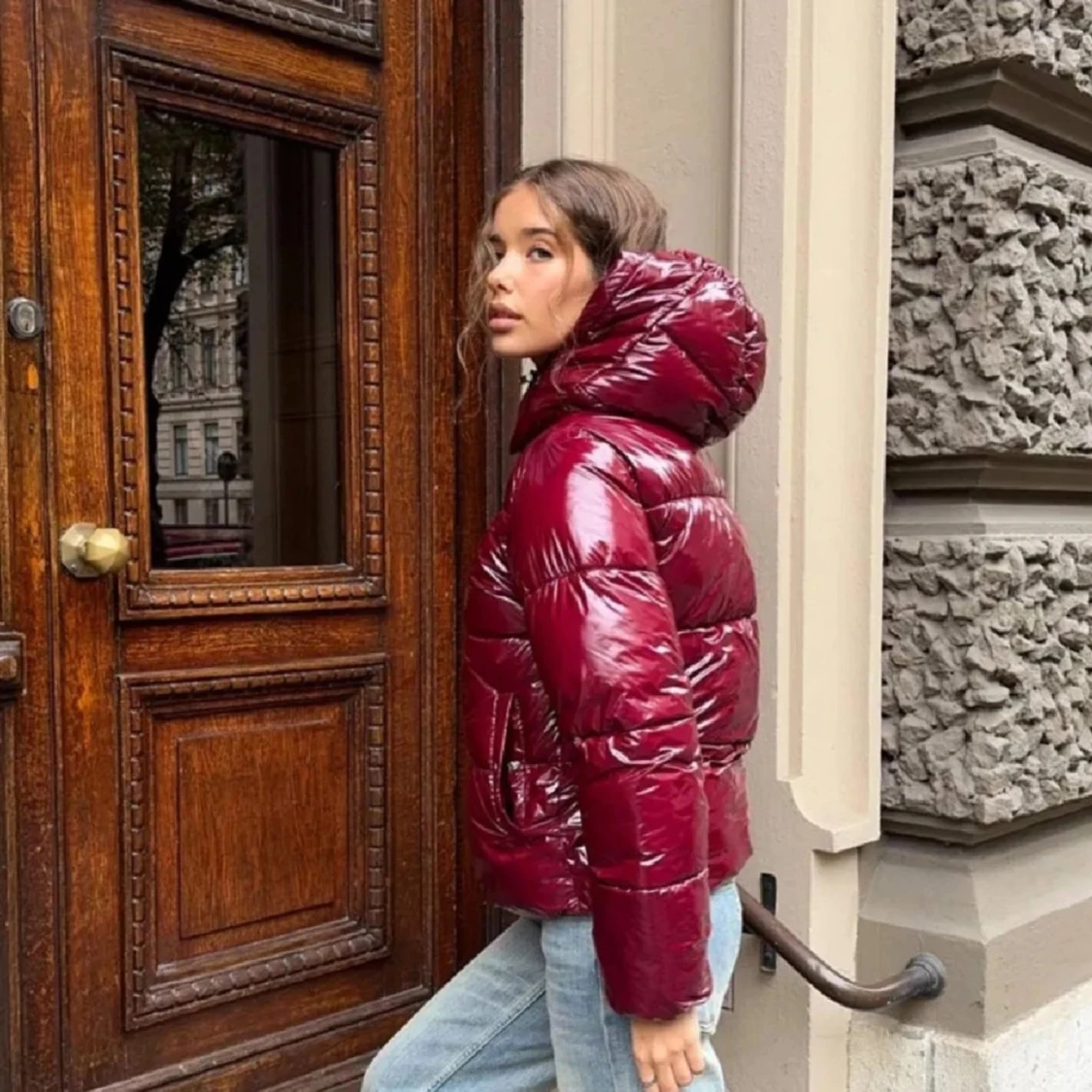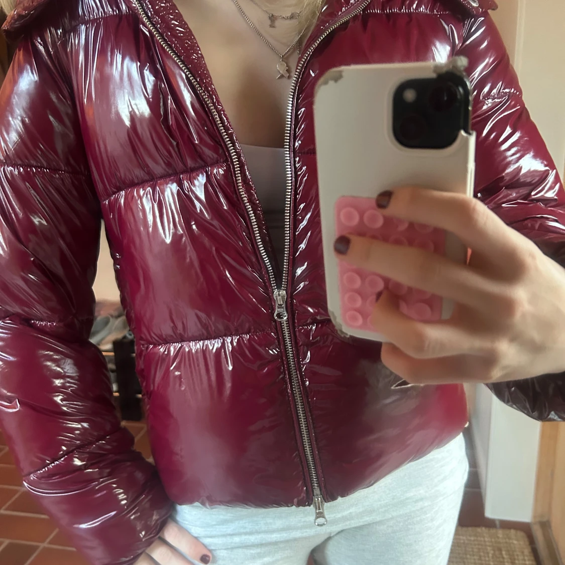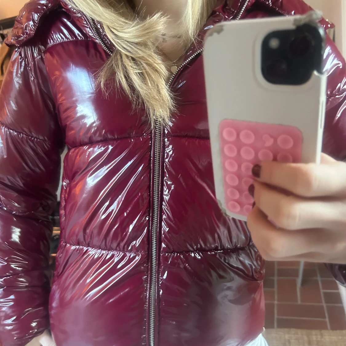 Säljer en snygg vinröd pufferjacka. Jackan är glansig och har en stor huva, perfekt för kalla dagar. Säljs inte längre och är knappt använd så är helt nyskick. Storlek XS. Skriv vid eventuella frågor!