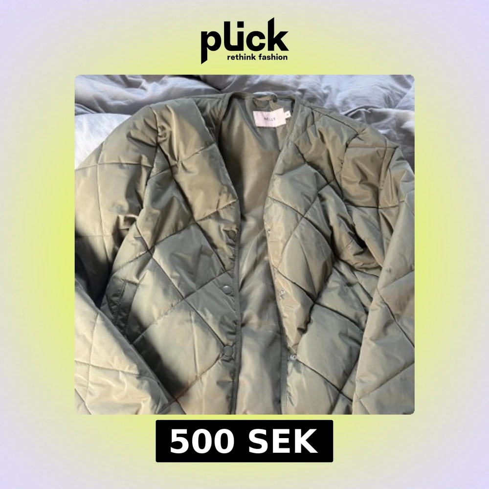 Quiltad pufferjacka från Nelly i olivgrönt med tryckknappar framtill. Jackan är slut i lager