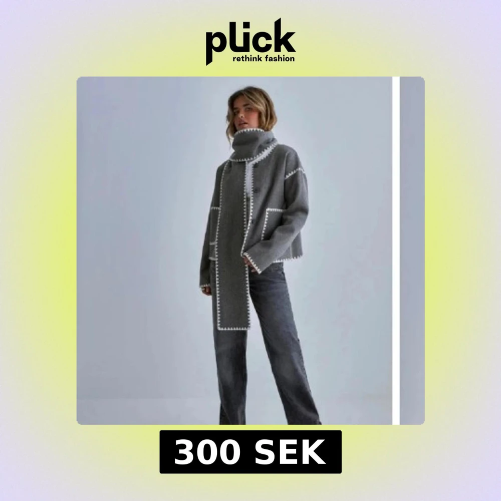 Säljer en grå jacka med vita dekorativa sömmar längs kanterna.
