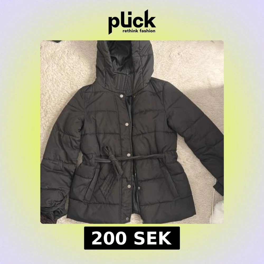 Svart pufferjacka med huva och knytbälte i midjan. Jackan är köpt från Nelly och är i storlek xs