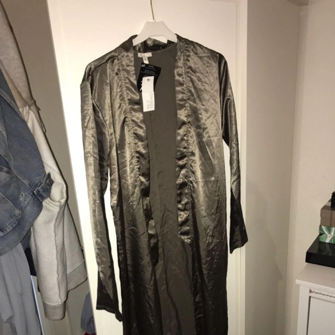 Fin lång tunn kappa. Går ner till fötterna. Aldrig använd, prislapp finns kvar.