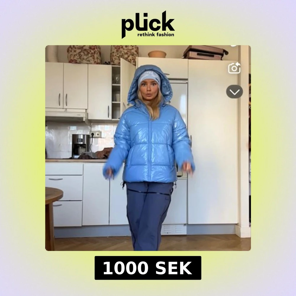Säljer en glansig ljusblå pufferjacka med huva och dragkedja. Jackan är vadderad och har en oversized vibe, perfekt för kalla dagar. Snygg och trendig modell som håller dig varm hela vintern.