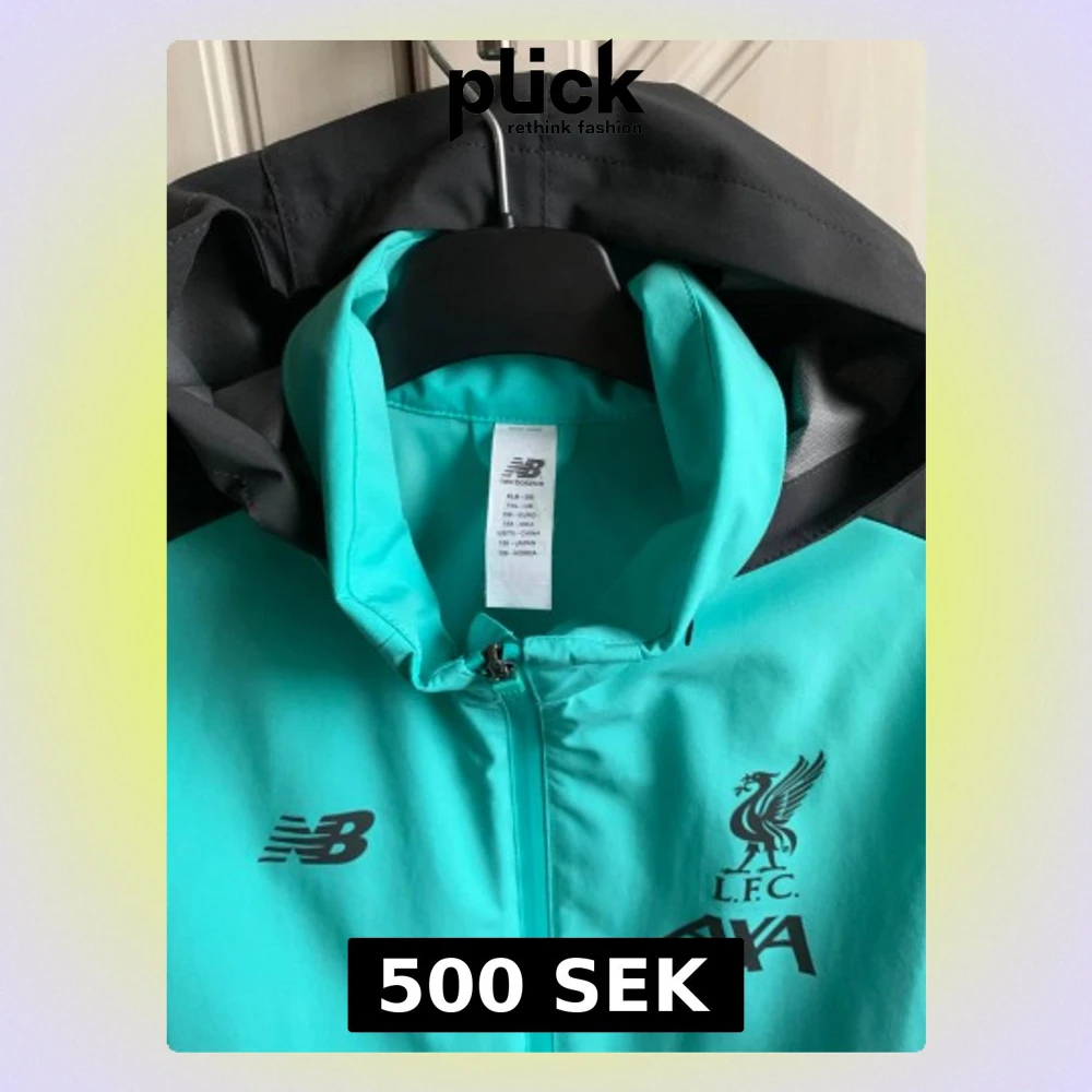 Snygg Liverpool FC vindjacka från New Balance i turkos och svart med huva. Jackan har dragkedja framtill, LFC-logga och AXA-tryck på bröstet. Perfekt för fotbollsfans som vill ha en sportig look. Långärmad och med coola kontrastpaneler på axlar och ärmar. Hade den när jag var ungifär 160 passade bra. Inte använt mycket