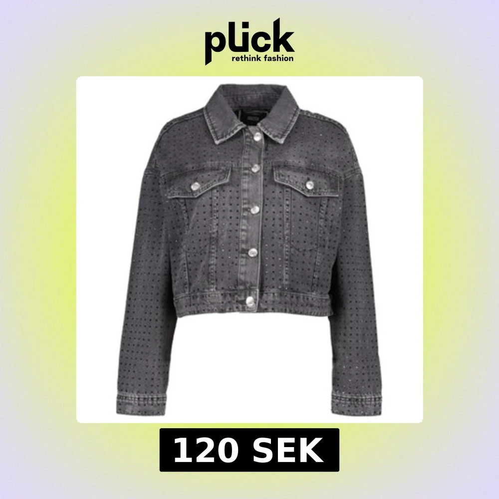 Snygg grå croppad jeansjacka från newyorker med strass över hela jackan. Klassisk krage, långa ärmar och knappar framtill samt på bröstfickorna. Perfekt för dig som vill sticka ut med en cool och trendig look.