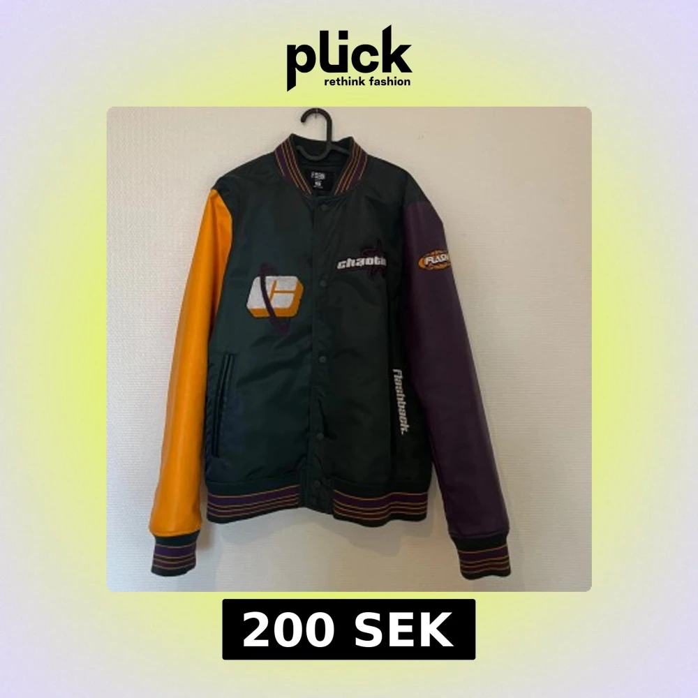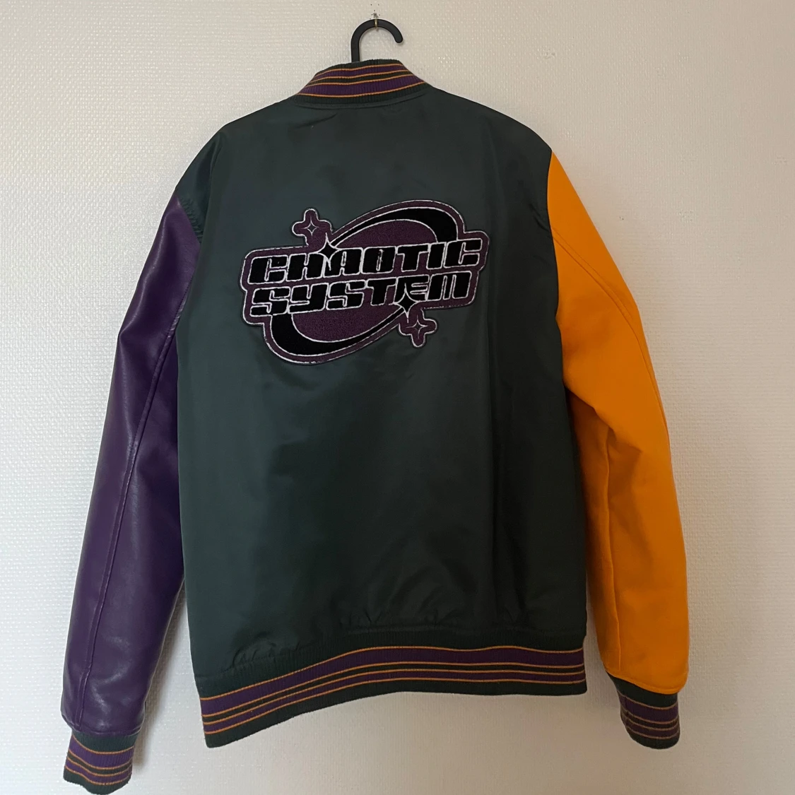 Bomberjacka med grön kropp och kontrasterande lila och gula ärmar. Jackan har broderade detaljer och knappar framtill.