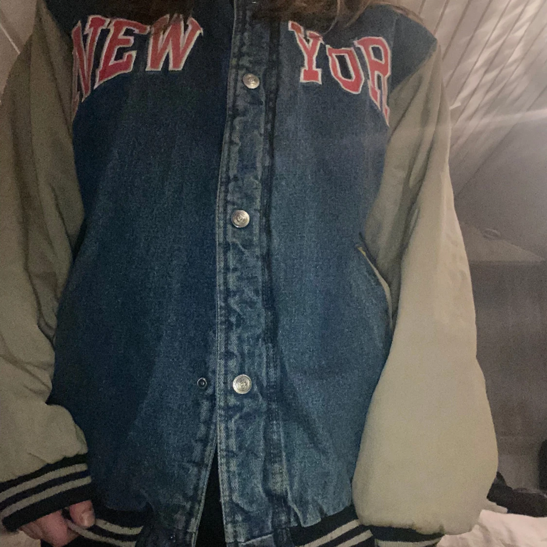 Snygg College jacka med trycket ”New York”. Väldigt skön lite overzised. Köpt begagnad men i väldigt bra skick! Jeans tyg, beiga armar och fodrad!