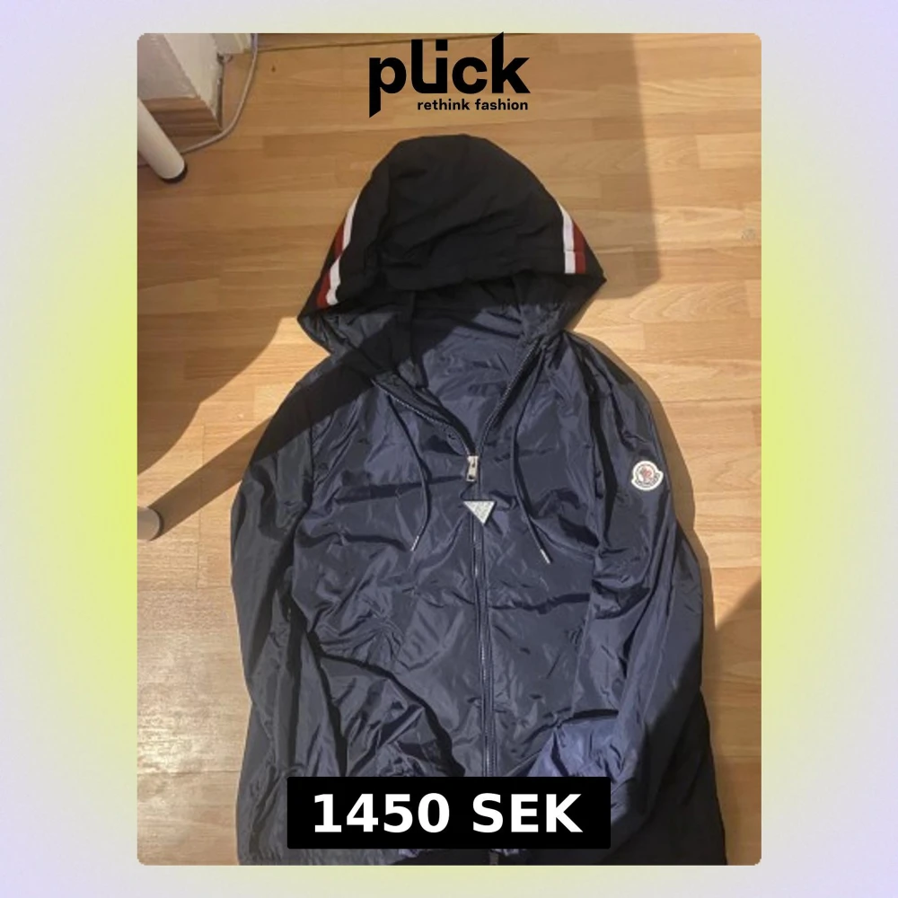 Snygg marinblå vindjacka från Moncler med huva och dragkedja framtill. Jackan har vita och röda ränder på huvan, Moncler-logga på ärmen och justerbara snören vid halsen. Tillverkad i lätt polyester, perfekt för blåsiga dagar. NFC tag funkar