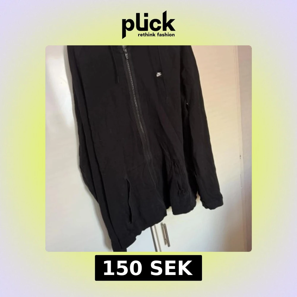 Säljer en svart hoodie från Nike med dragkedja och fickor framtill. Perfekt för en avslappnad stil. Den har långa ärmar och en liten Nike-logga på bröstet.