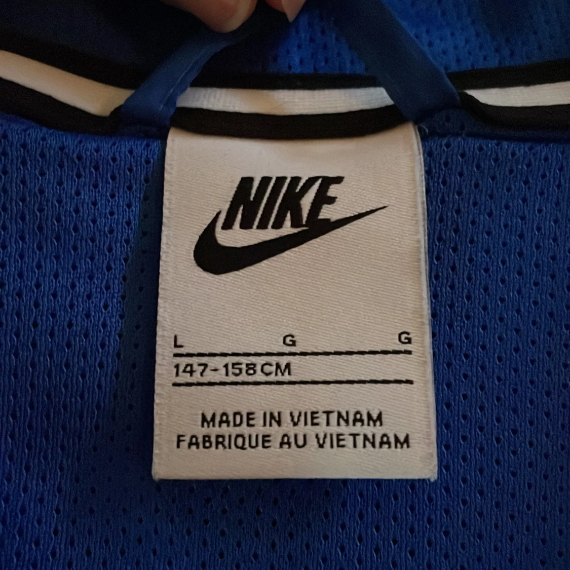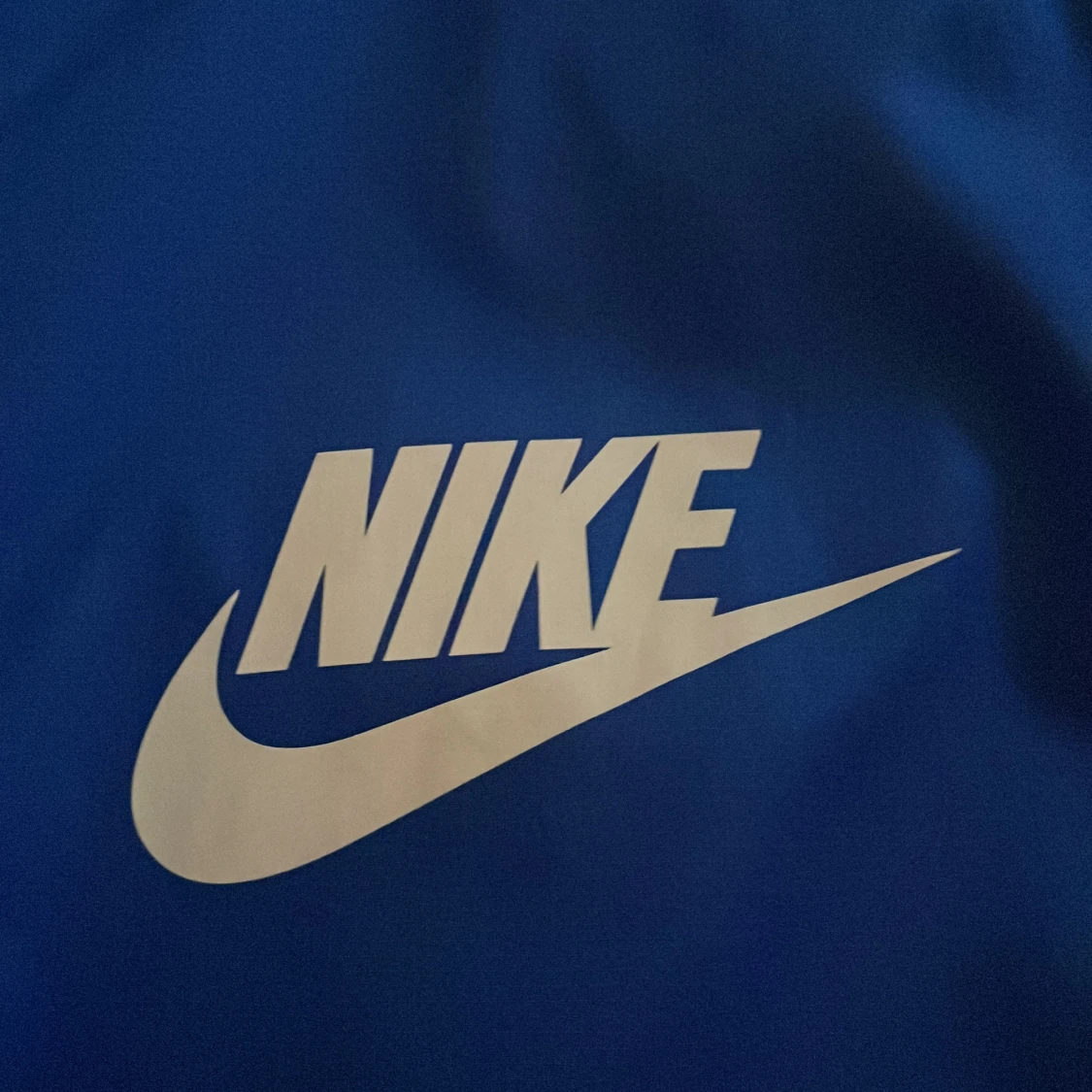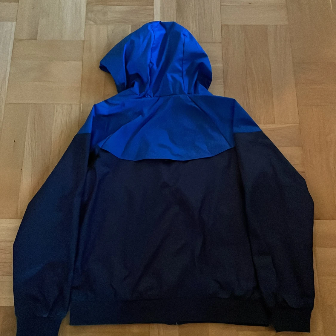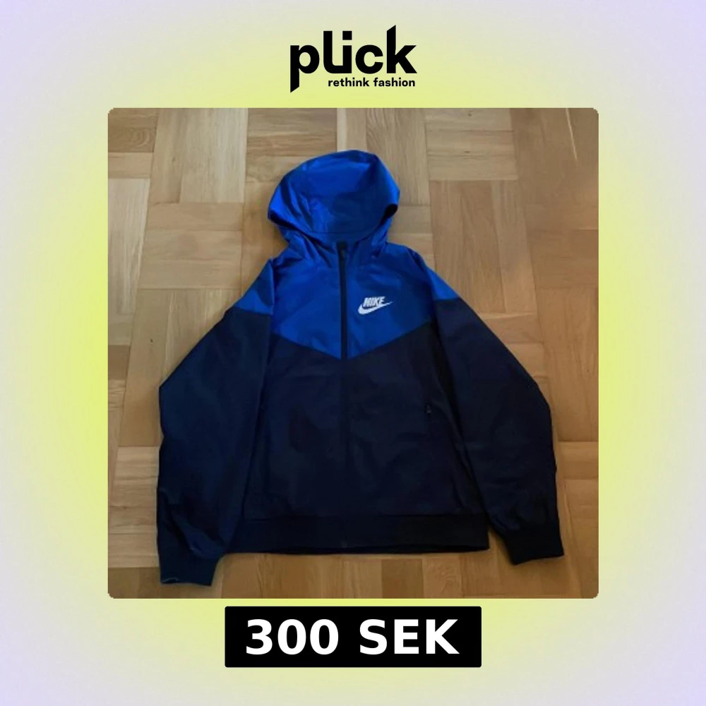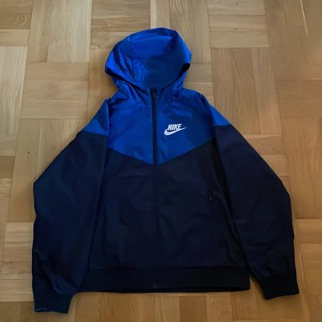 Nike vindjacka i blått och svart med huva och hel dragkedja framtill. Jackan har stor Nike-logga på bröstet och är tillverkad i lätt polyester. Perfekt för dig som gillar sportig stil och vill ha något snyggt och funktionellt. Pris går att diskutera