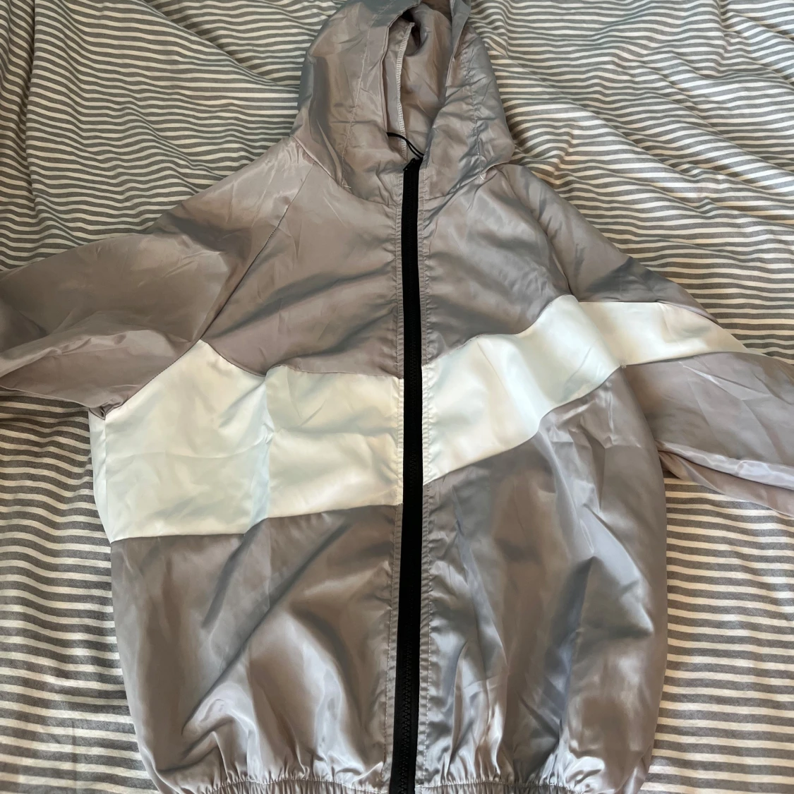 Snygg grå vindjacka med huva och en bred vit diagonal rand över bröstet. Jackan har hel dragkedja framtill och resår i nederkant och ärmslut. Perfekt för blåsiga dagar och enkel att slänga på sig över en hoodie.