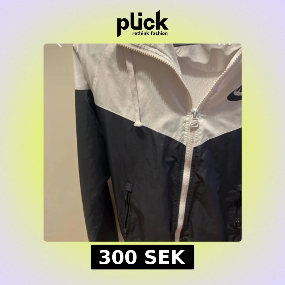 Säljer en snygg svart och vit vindjacka från Nike med dragkedja och huva. Jackan har en klassisk design med Nike-logga på bröstet och justerbara snören vid huvan. Perfekt för blåsiga dagar!