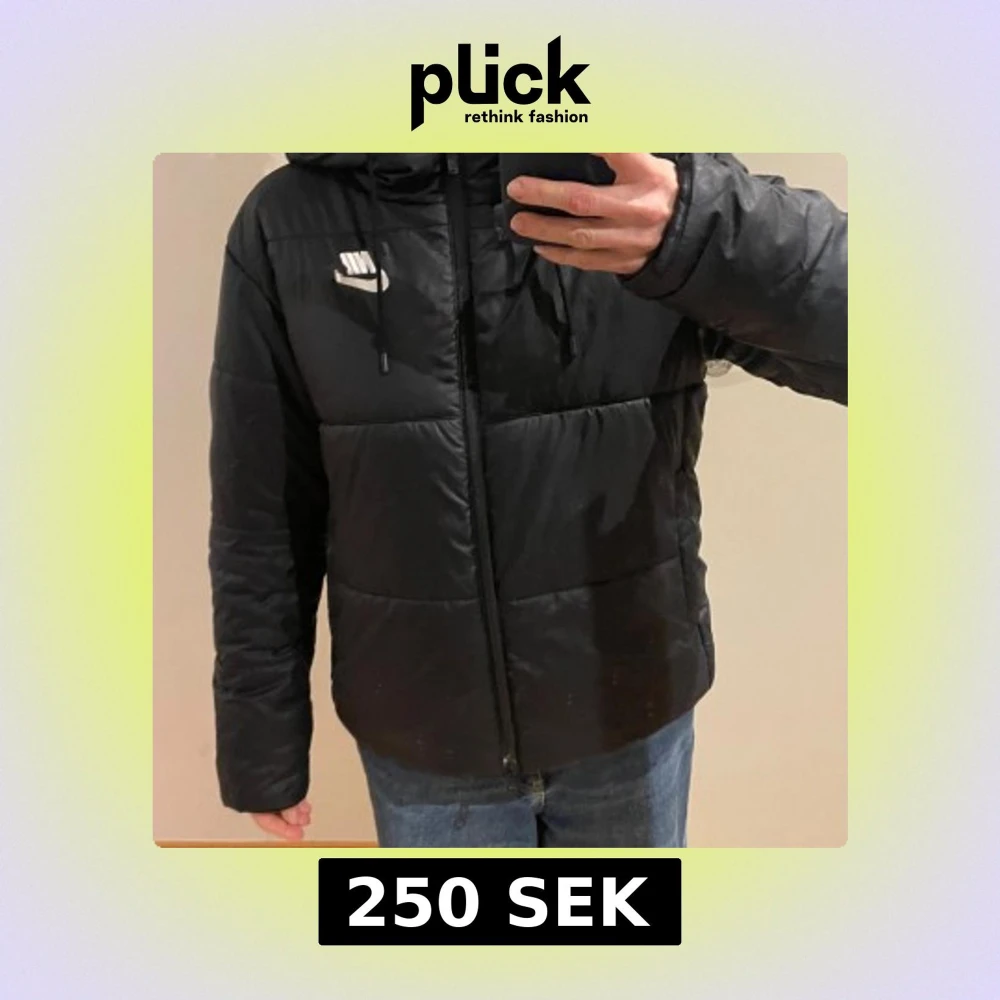 Säljer en svart pufferjacka från Nike med huva och dragsko. Jackan har en enkel look med diskret Nike-logga på bröstet, dragkedja framtill. Bruksanvänd, inga defekter. Storlek M.