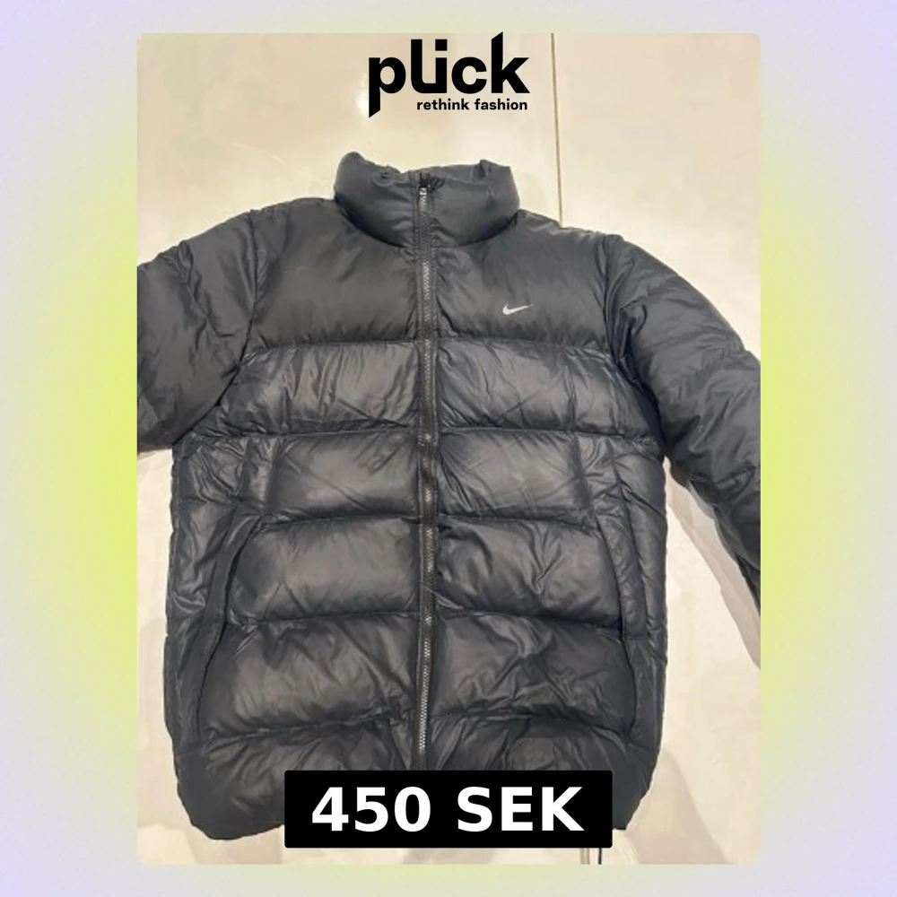 Svart pufferjacka från Nike - Säljer en svart pufferjacka från Nike med dragkedja och huva. Jackan har en sportig look med två praktiska fickor framtill. Perfekt för kyliga dagar.