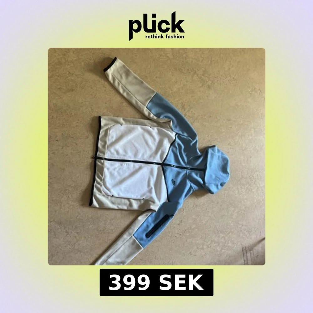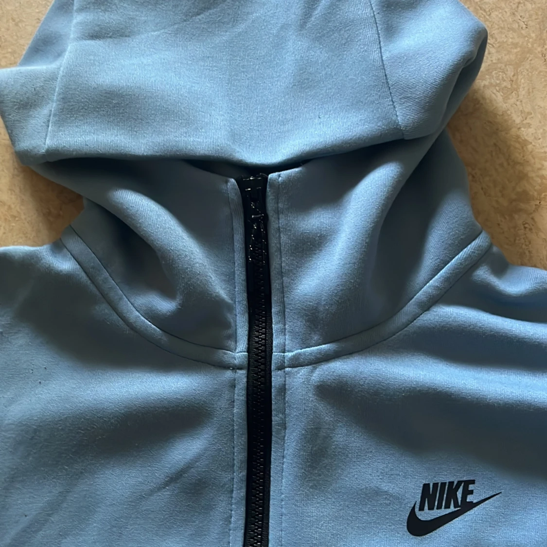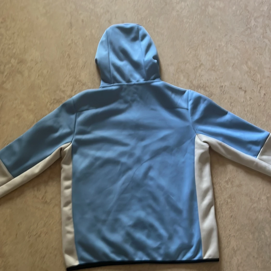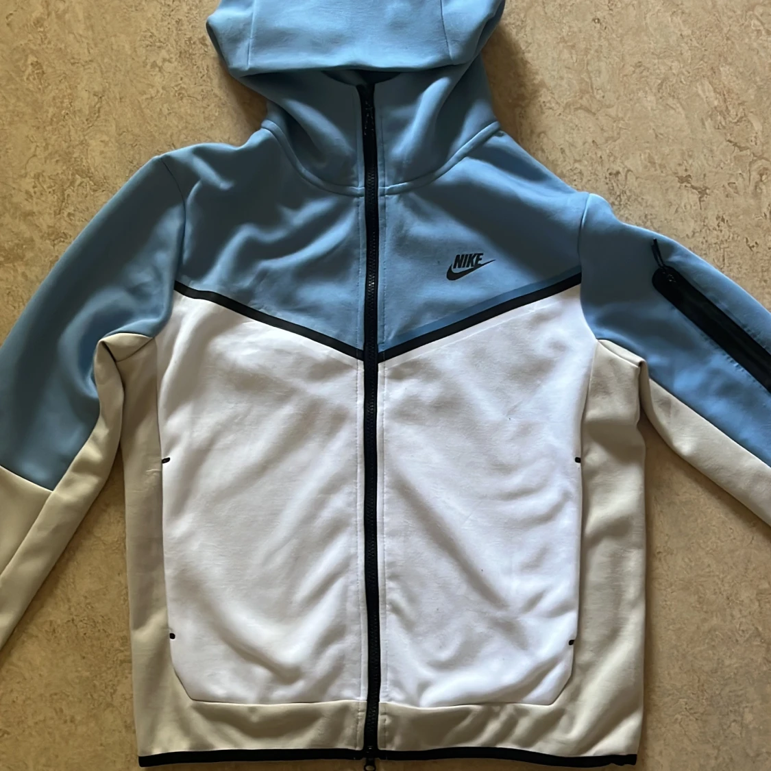Nike vindjacka i ljusblått och vitt med svarta detaljer. Jackan har huva, hel dragkedja framtill och en extra ficka med dragkedja på ena ärmen. Priset kan diskuteras vid snabb affär.