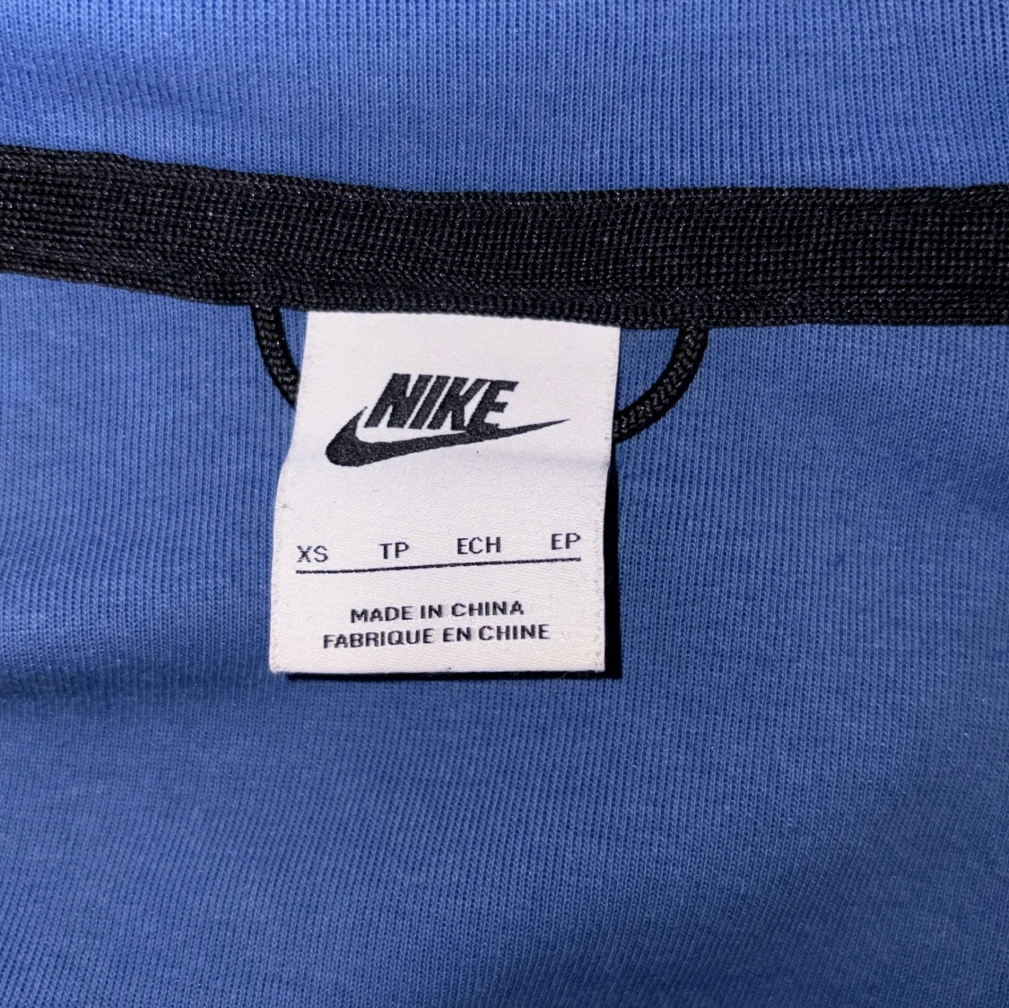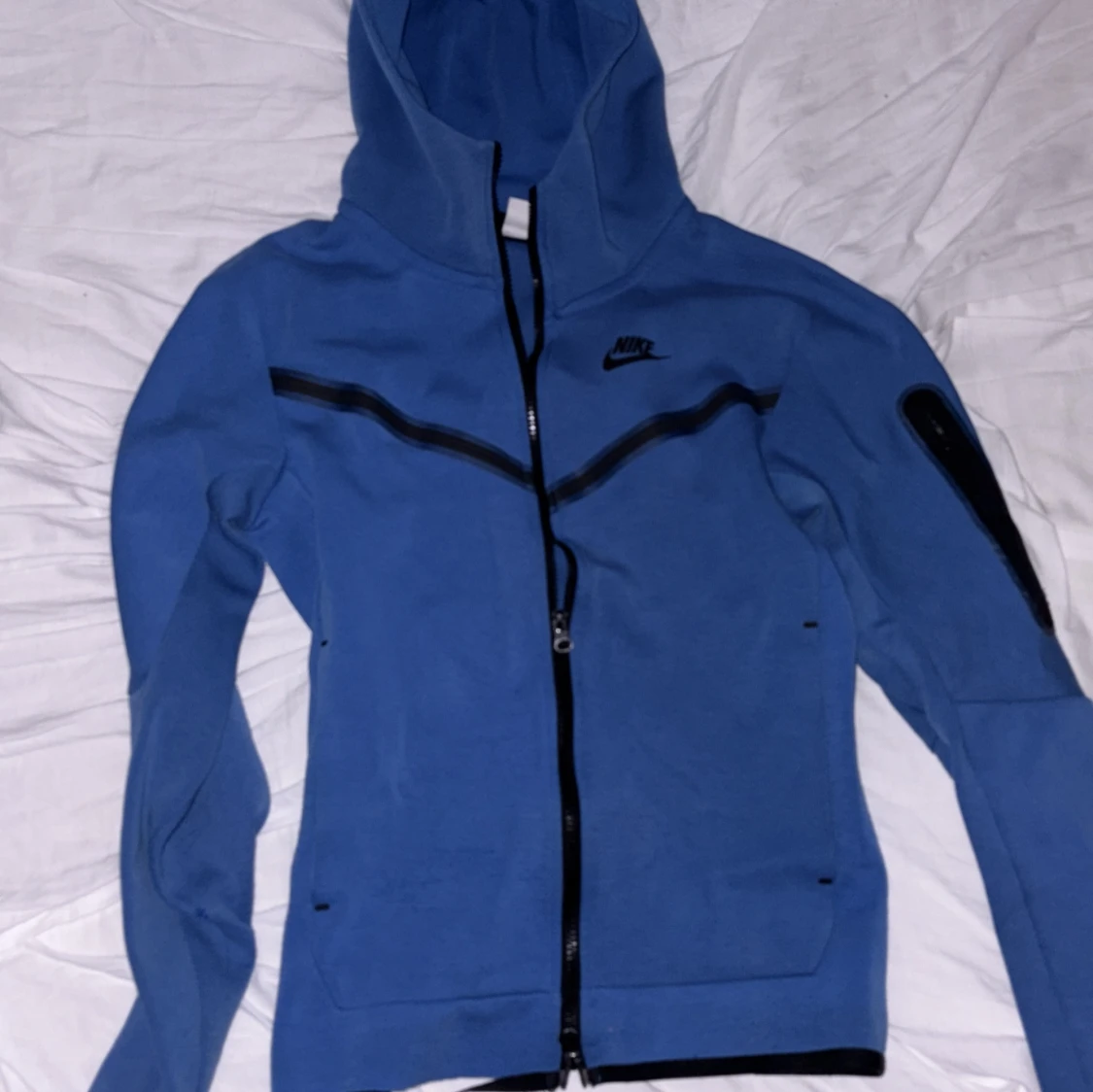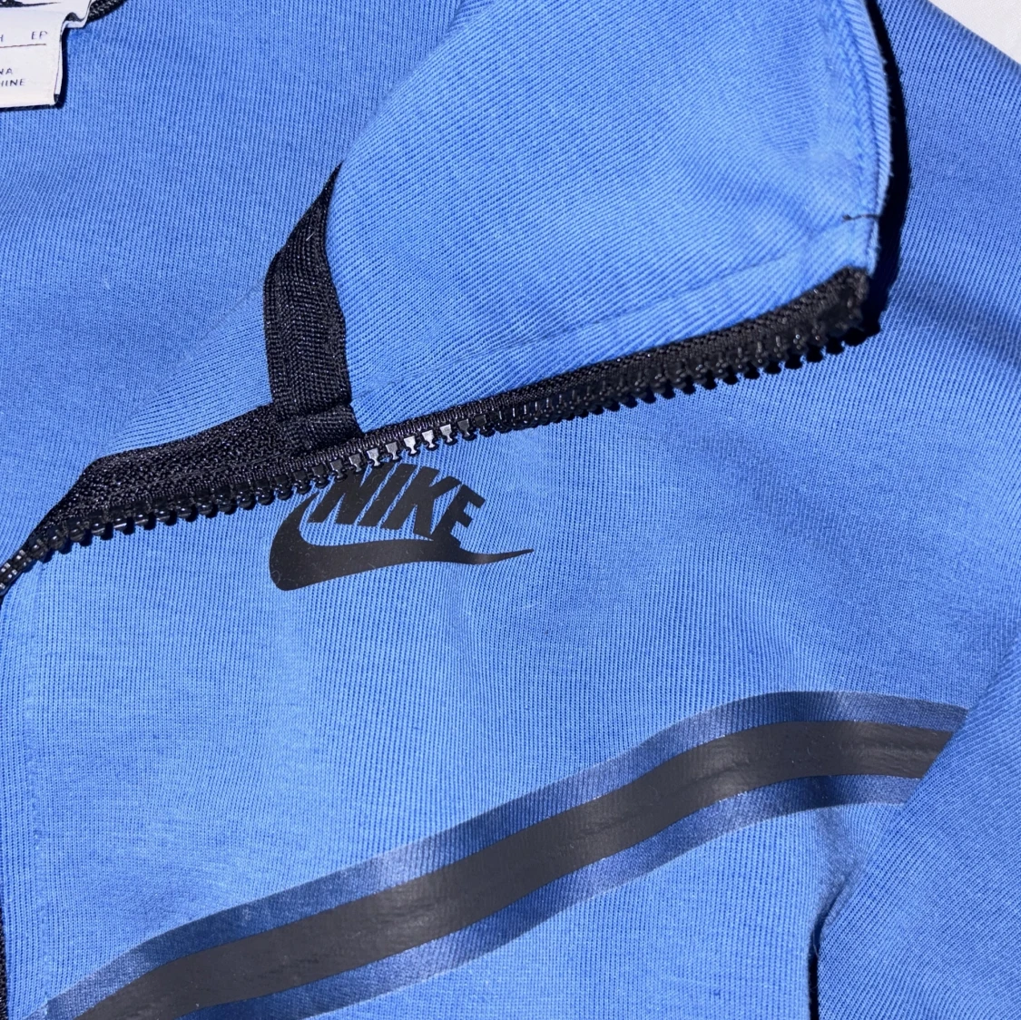 Säljer en blå hoodie från Nike med dragkedja och huva. Jackan har svarta detaljer, inklusive en sned dragkedja över bröstet och Nike-logga. Fickor framtill och ribbade muddar. Perfekt för en sportig stil.