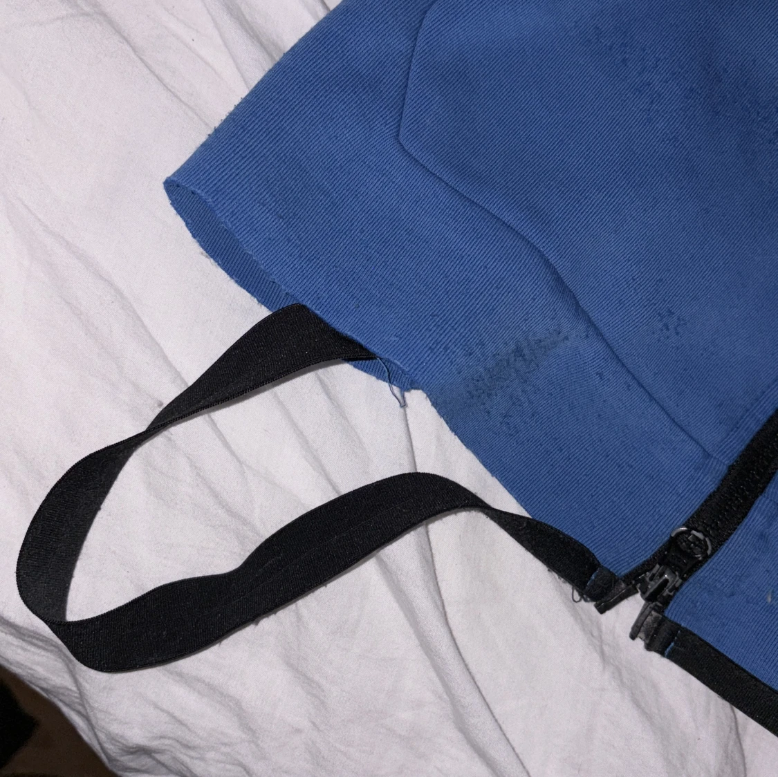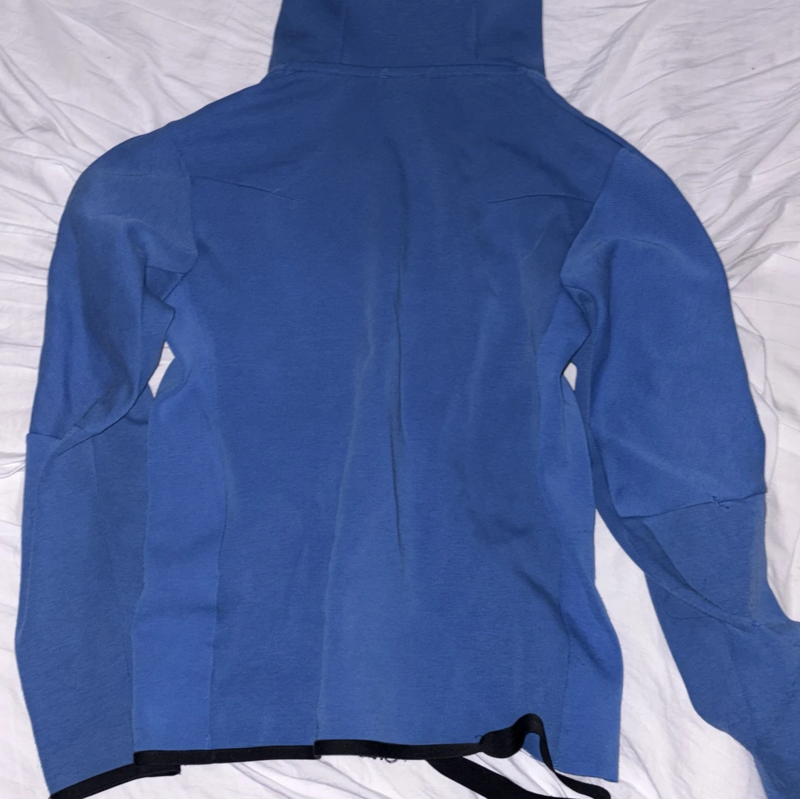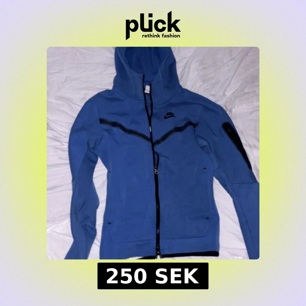 Säljer en blå hoodie från Nike med dragkedja och huva. Jackan har svarta detaljer, inklusive en sned dragkedja över bröstet och Nike-logga. Fickor framtill och ribbade muddar. Perfekt för en sportig stil.