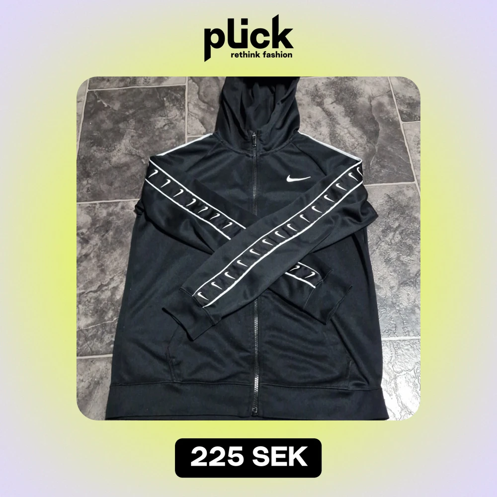 Säljer en svart huvtröja från Nike i bra skick. Den har en dragkedja framtill och vita Nike-loggor längs ärmarna. Perfekt för höst och vår, med en sportig look. Tröjan är långärmad och gjord i ett mjukt syntetmaterial. Passar både för träning och vardagsbruk.