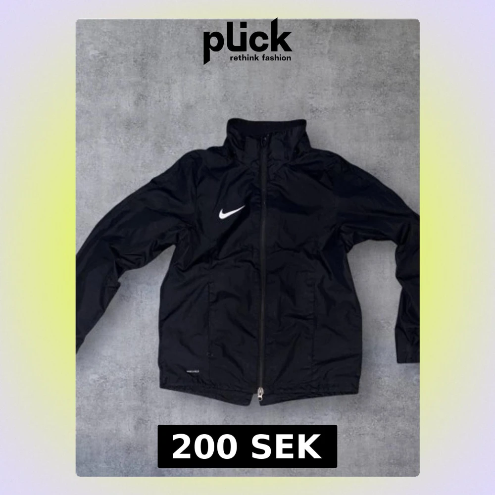 Svart Nike Shield vindjacka med hög krage och vit Nike-logga på bröstet. Jackan har hel dragkedja framtill och är tillverkad i lätt polyester som står emot vind. Perfekt för dig som gillar sportig stil och vill ha något funktionellt och snyggt.