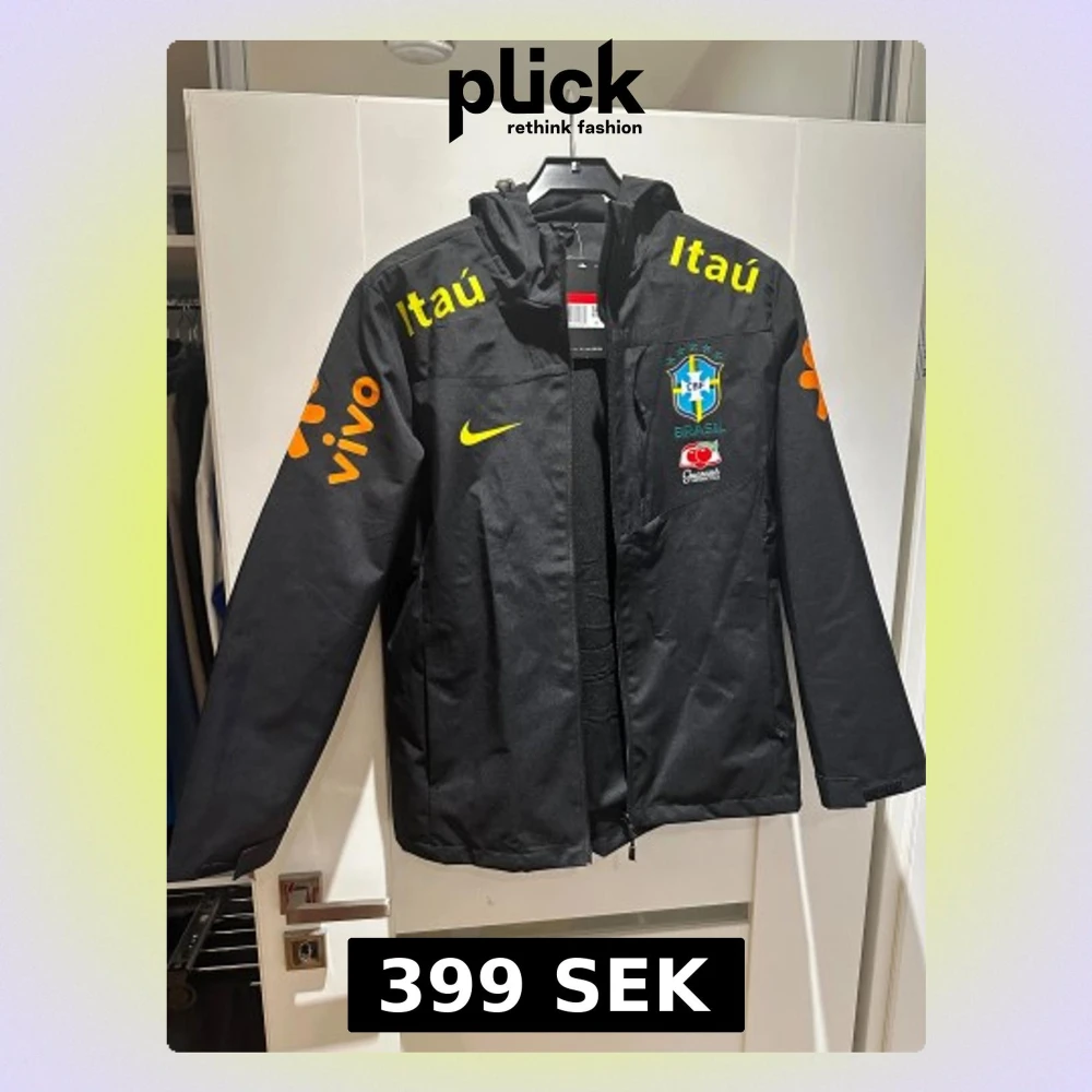 Svart vindjacka från Nike med Brasil CBF-logga, gula och orange tryck. Jackan har huva, dragkedja och långa ärmar. Jackan är mindre i storlek. Så om du är 170-177 cm lång passar den dig. Skriv över det minsta lilla!