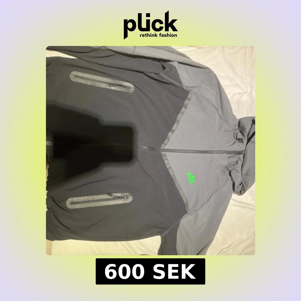 Nike vindjacka i svart och grått med huva och hel dragkedja. Jackan har två vattentäta fickor med dragkedja och en grön Nike-logga på bröstet. Tillverkad i polyester, perfekt för blåsiga dagar. Sportig och clean look.