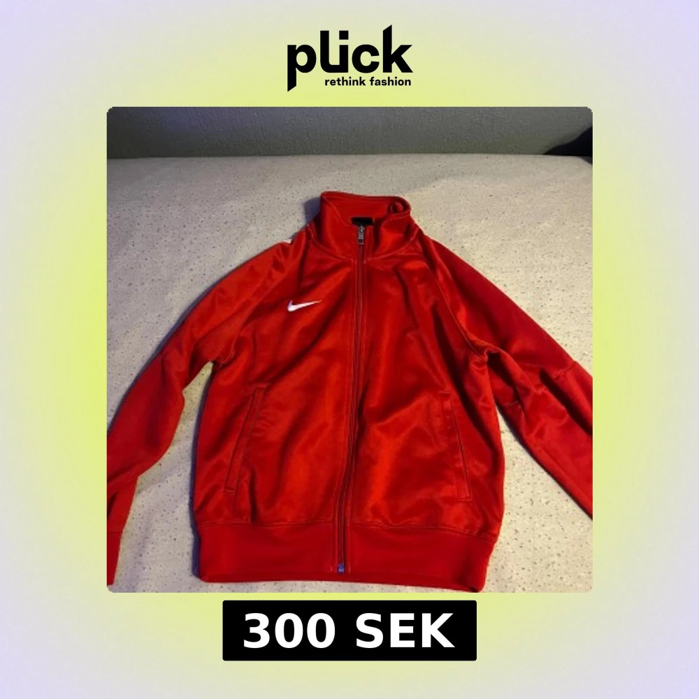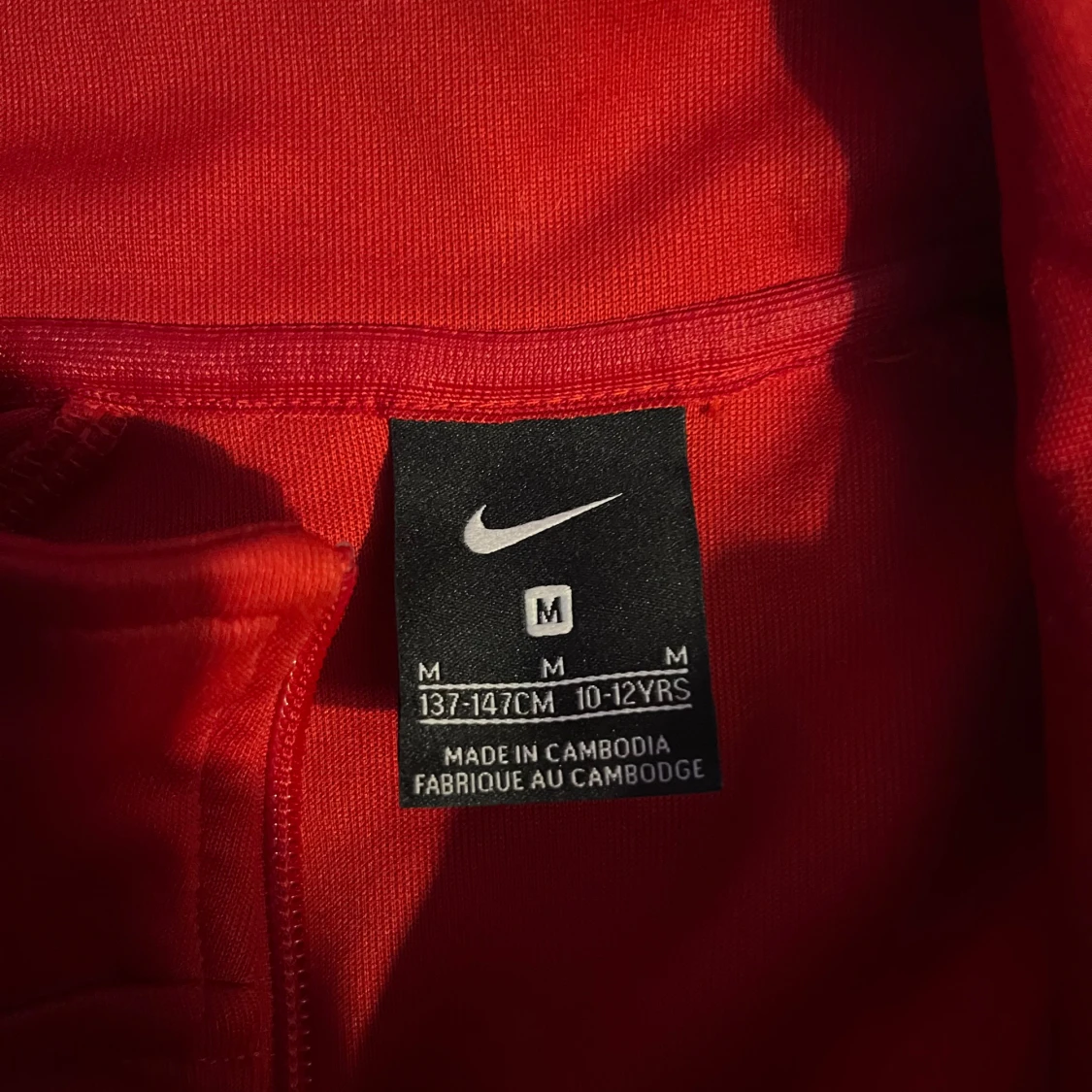 Säljer en röd träningsjacka från Nike med dragkedja och hög krage. Jackan har långa ärmar och en vit Nike-logga på bröstet. Perfekt för sportiga aktiviteter eller som en snygg vardagsjacka. Storlek M (Barnstorlek) 137-147cm (10-12år)