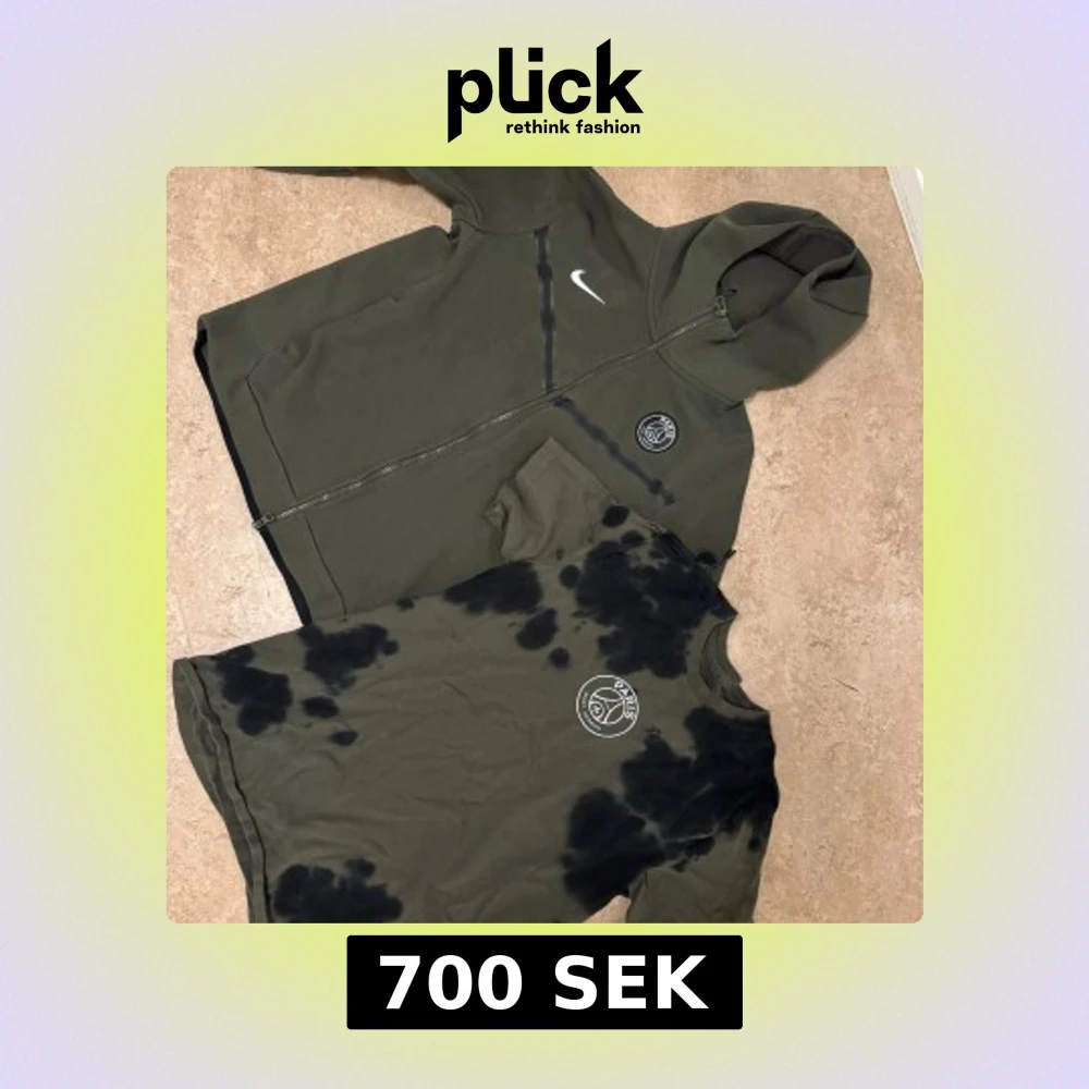 Säljer en grön Nike PSG vindjacka med huva och hel dragkedja. Jackan har PSG-logga på bröstet och vit Nike Swoosh. Snygga svarta detaljer längs dragkedjan och fickor. Perfekt för dig som gillar sportig streetstyle och Paris Saint-Germain.