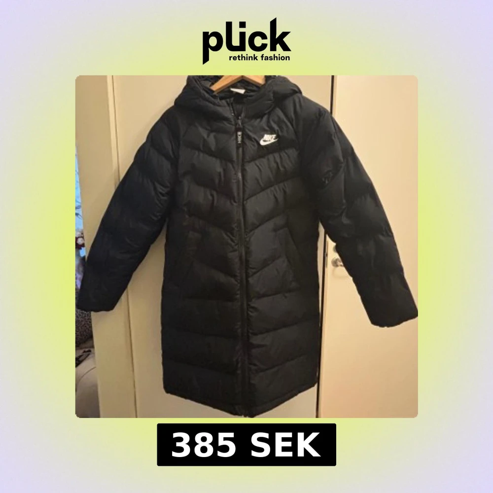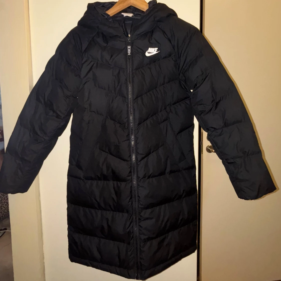 Barn jacka 145-150cm lång och i storlek M Svart lång pufferjacka från Nike med huva och vit logga på bröstet. Jackan har quiltad design, dragkedja framtill och är perfekt för kalla dagar. Materialet är syntet och jackan har en normal passform med långa ärmar.
