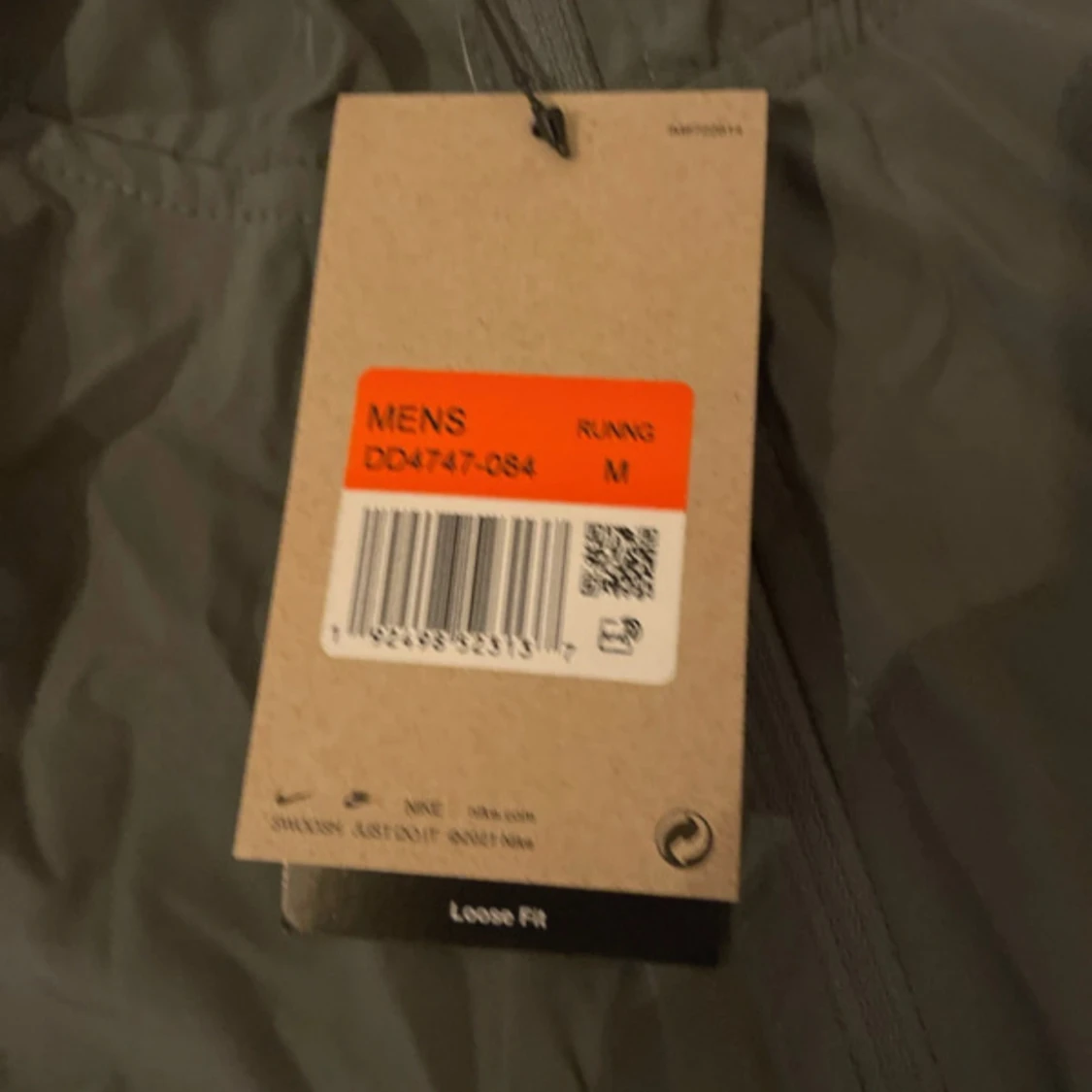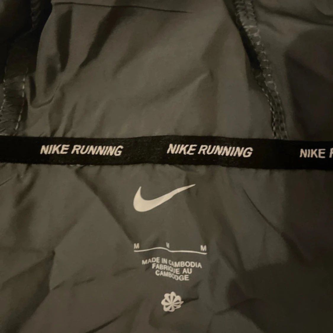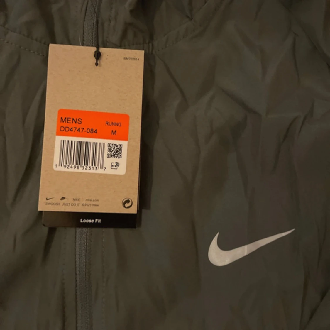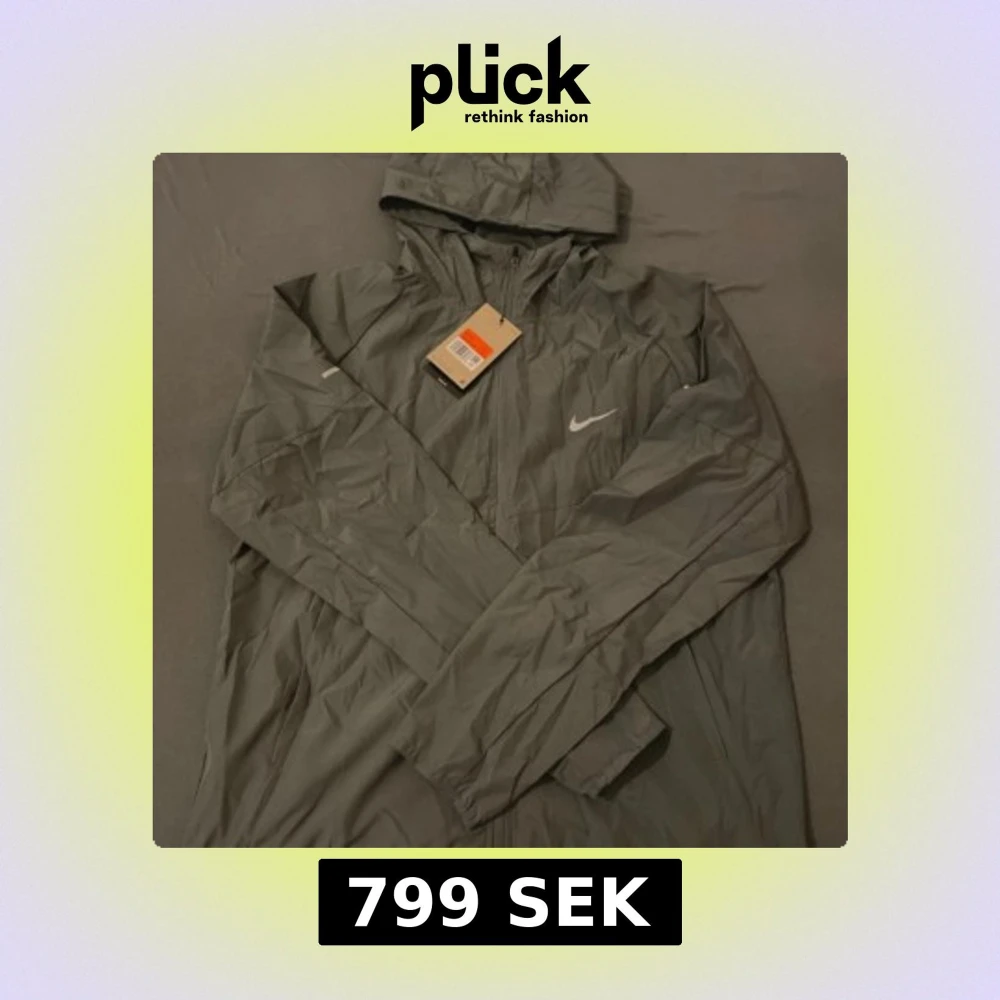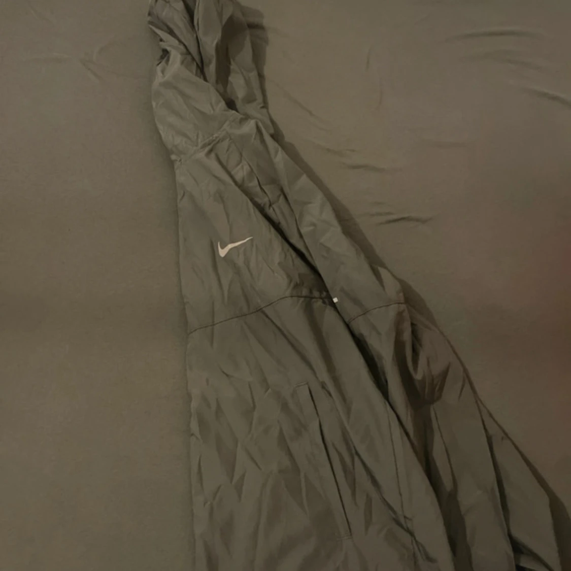 Grå vindjacka från Nike med vit logga på bröstet och huva.