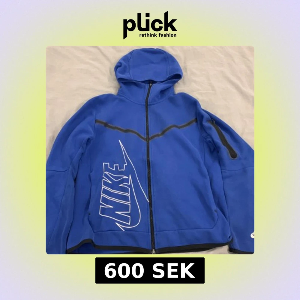 Blå hoodiejacka från Nike med hel dragkedja, svart detalj längs bröstet och ärmficka med dragkedja. Stor Nike-logga i vitt på framsidan. Jackan har huva och är långärmad, perfekt för en sportig look.