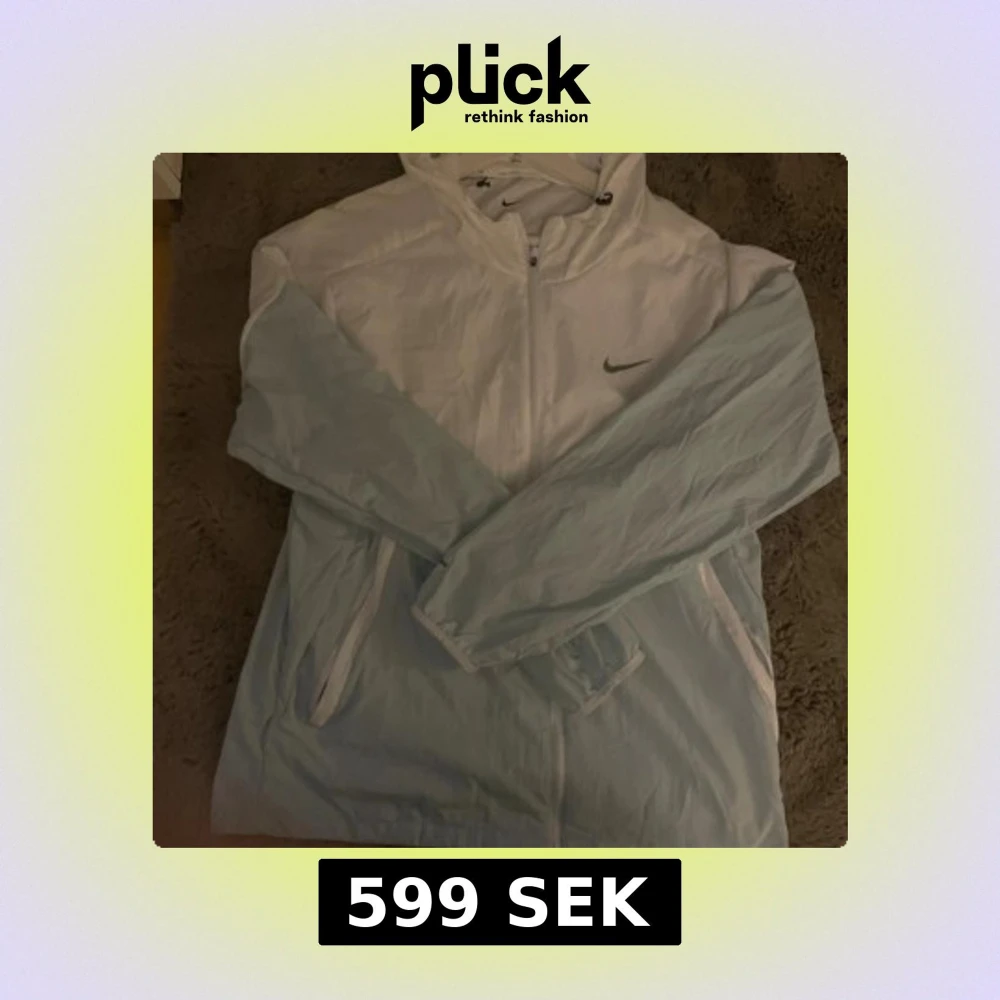 Nike vindjacka i vitt och ljusblått med dragkedja framtill och huva. Jackan har meshfoder, två fickor med dragkedja och klassisk Nike-logga på bröstet. Perfekt för blåsiga dagar och sportiga outfits.