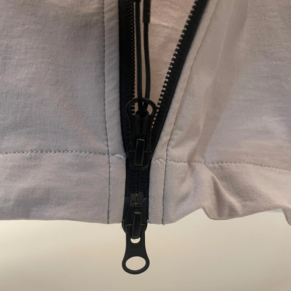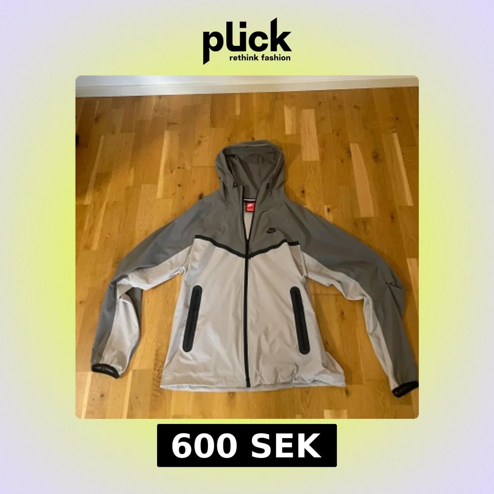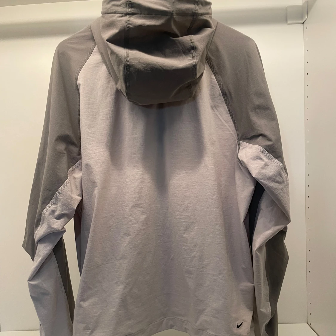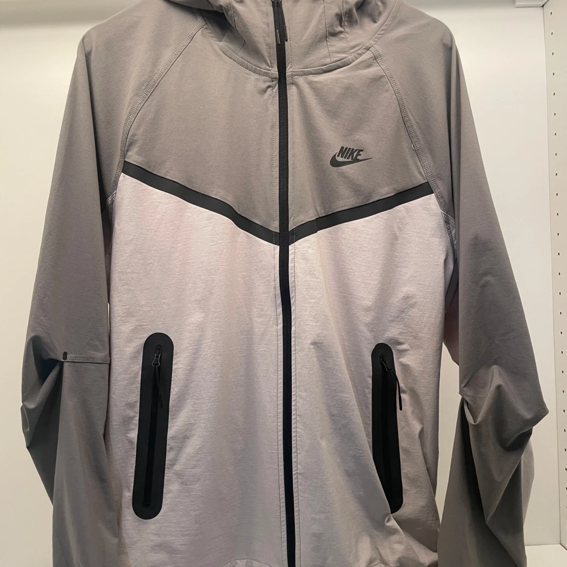 Storlek M, aldrig använt.Snygg grå vindjacka från Nike med tvåvägsdragkedja, huva och svarta detaljer. Jackan har två praktiska fickor med dragkedja och en sportig design med mörkare grå partier på axlar och ärmar. Perfekt för blåsiga dagar och streetwear-stil.