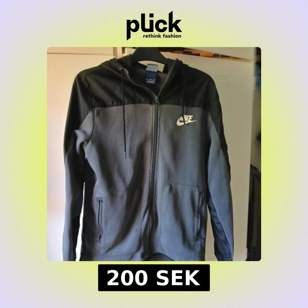 Nike vindjacka i svart och mörkgrått med huva och dragsko. Jackan har hel dragkedja, två fickor med dragkedja och Nike-logga på bröstet. Materialmix med slät polyester upptill och mjukare tyg nedtill. Perfekt för chill eller träning. Har dock en fläck deför så billigt. Storlek m.