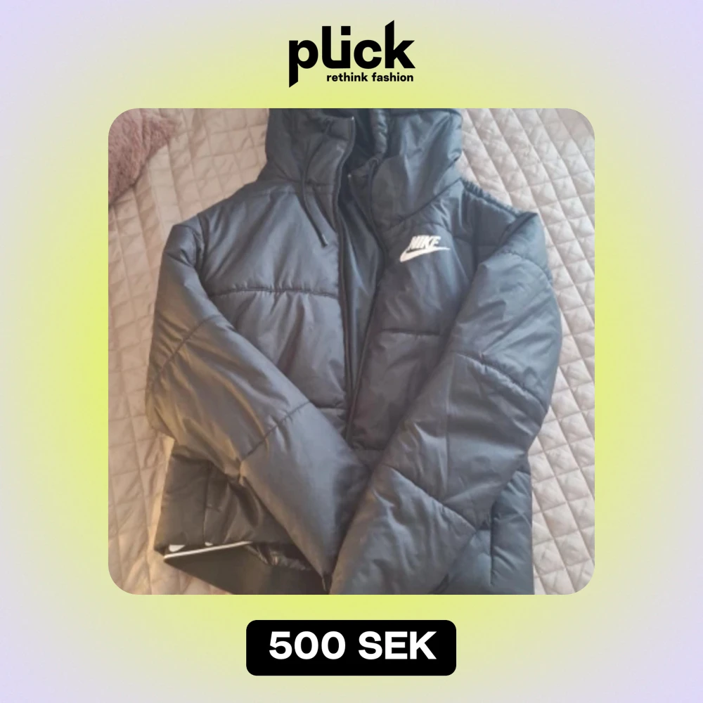 Säljer en svart pufferjacka från Nike i storlek XS. Jackan är perfekt för kalla dagar med sin vadderade design och har en dragkedja framtill. Den har en huva för extra skydd mot väder och vind. Nike-loggan syns tydligt på bröstet och längs nederkanten, vilket ger en sportig look.
