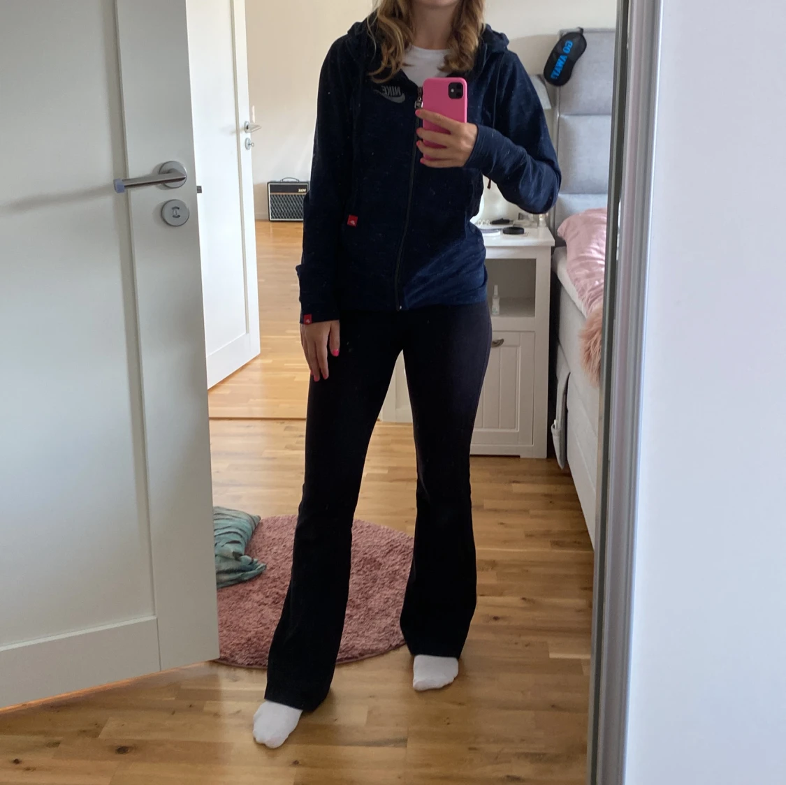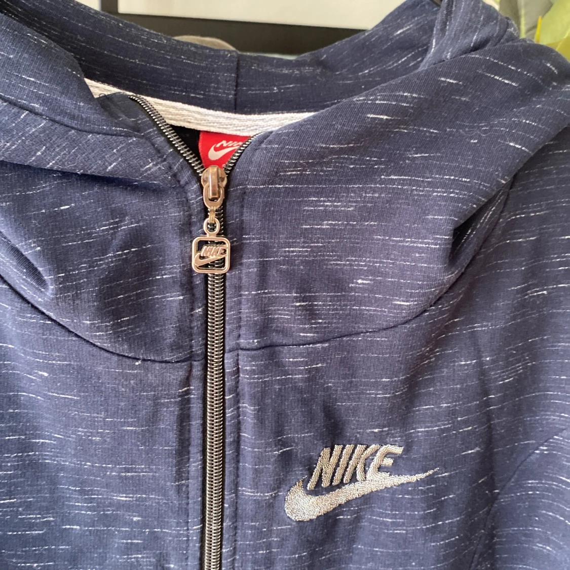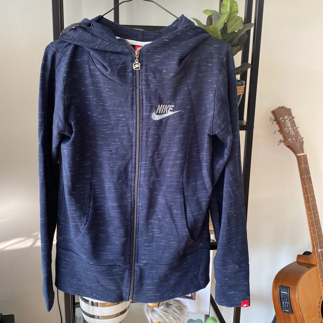 Säljer en snygg mörkblå hoodie från Nike med dragkedja och huva. Den har ett diskret mönster och Nike-loggan broderad på bröstet. Perfekt för en avslappnad stil!