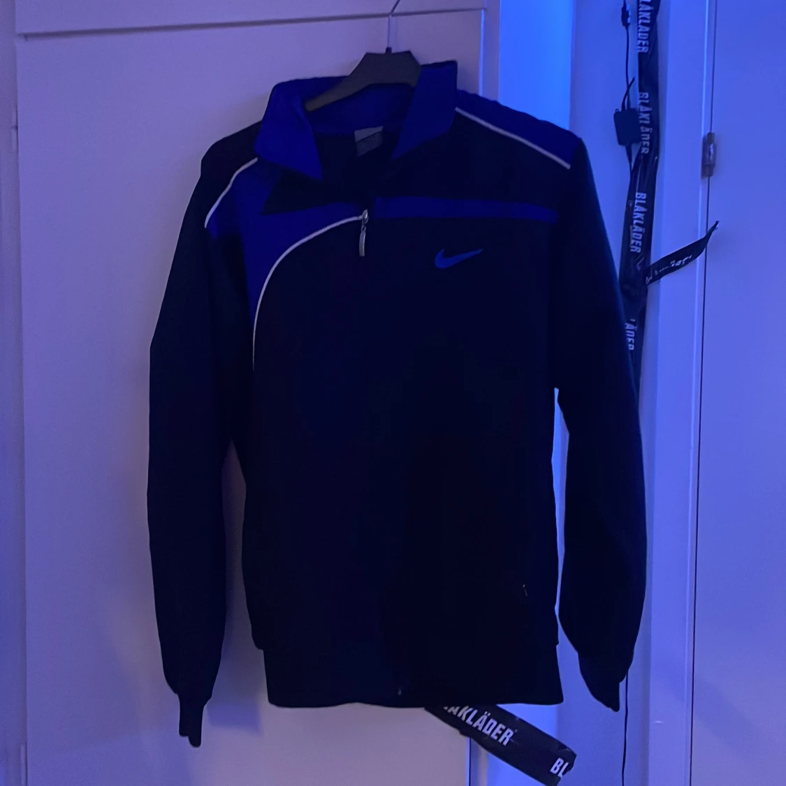 Säljer en svart och blå träningsjacka från Nike med dragkedja framtill och vit detalj på bröstet. Jackan har lång ärm och klassisk sportig design med Nike-logga på bröstet. Perfekt för dig som gillar sportig stil.