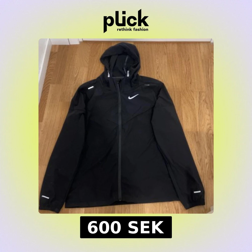 Svart vindjacka från Nike med huva och reflekterande detaljer på axlar och ärmar. Jackan har dragkedja framtill och en stilren design med Nike-logga på bröstet. Perfekt för träning utomhus när det blåser. Långärmad och lätt material.