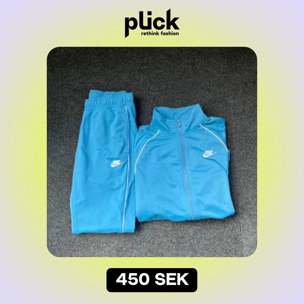 Säljer ett snyggt blått träningsset från Nike. Setet består av en långärmad jacka med dragkedja och matchande byxor. Perfekt för träning eller en avslappnad dag. Nike-loggan syns tydligt på både jackan och byxorna. Setet är i bra skick och redo för nya äventyr!