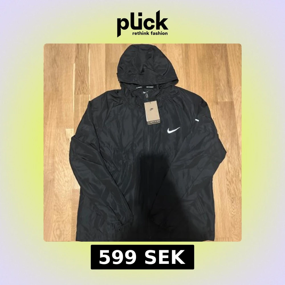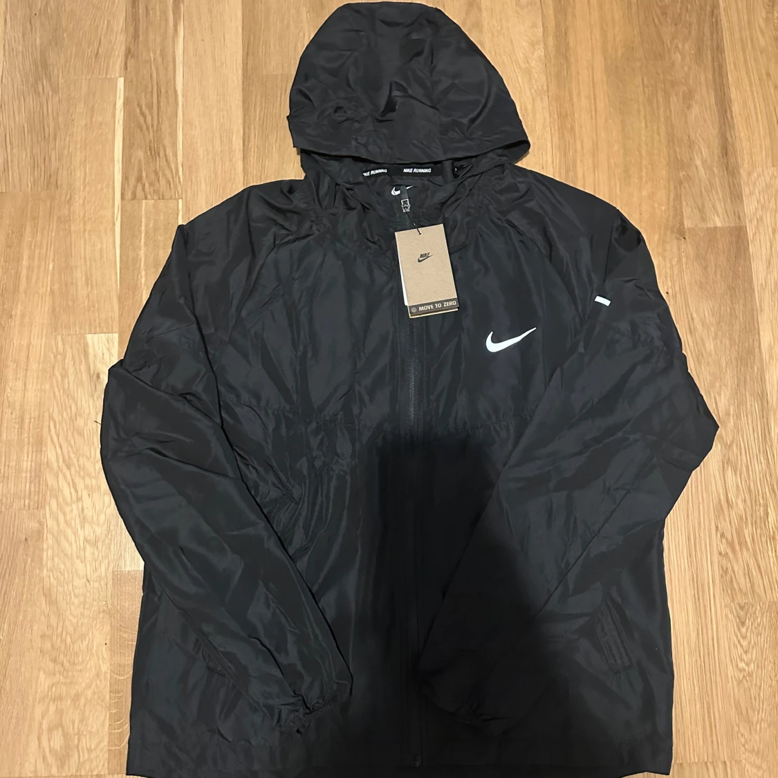 Svart vindjacka från Nike med klassisk vit logga på bröstet och hel dragkedja framtill. Jackan har huva, långa ärmar och elastiska muddar. Perfekt för blåsiga dagar och sportiga outfits.